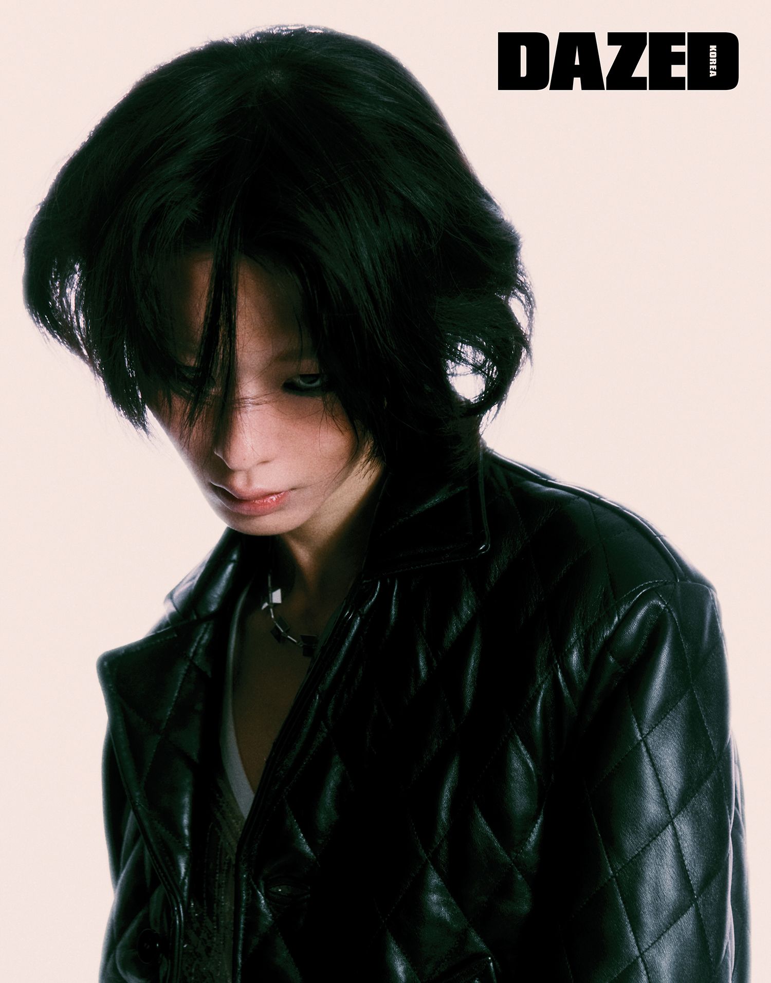 레더 쇼트 재킷은 어니스트 W. 베이커(Ernest W. Baker), 크리스털 장식 톱은 뮌(Münn), 네크리스는 산쿠안즈(Sankuanz).