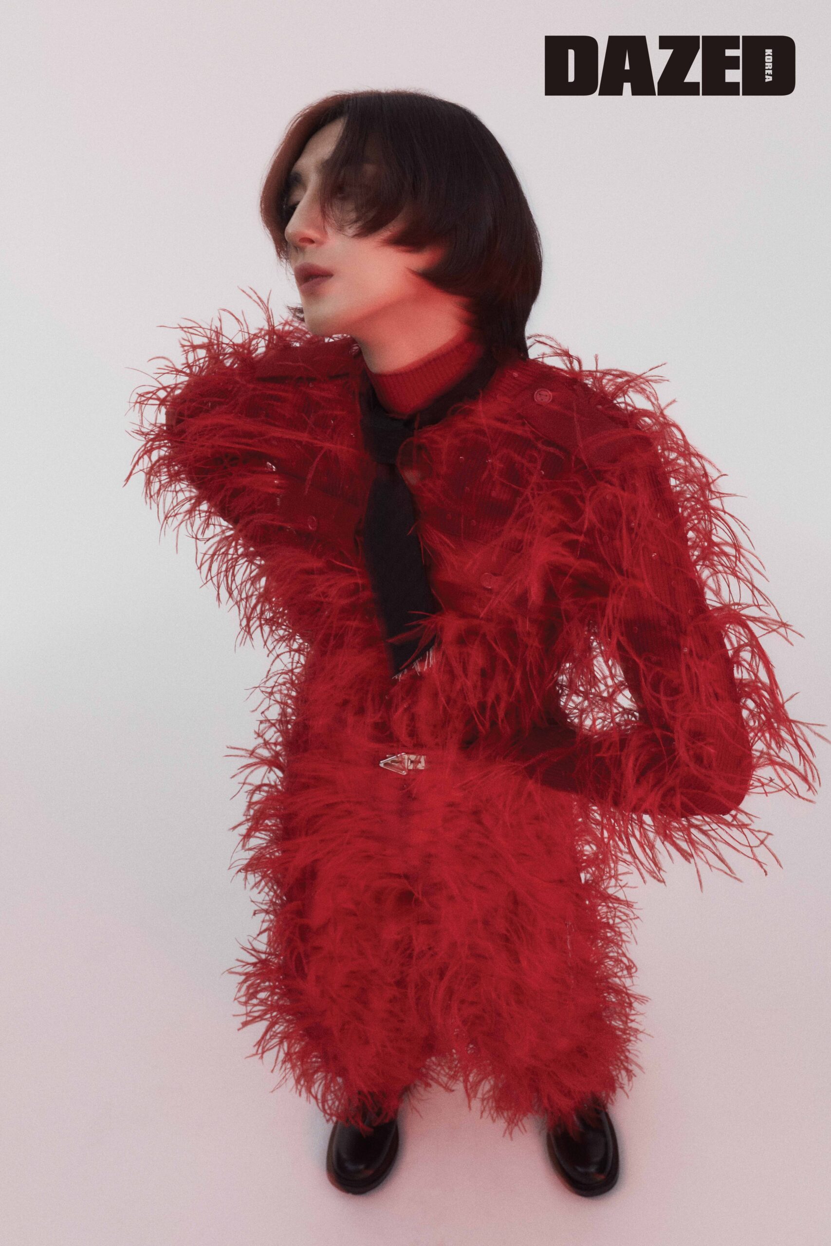 레드 페더 톱과 팬츠는 보테가 베네타(Bottega Veneta), 블랙 워커는 알렉산더 맥퀸(Alexander McQueen), 블랙 타이는 뮌(Münn).