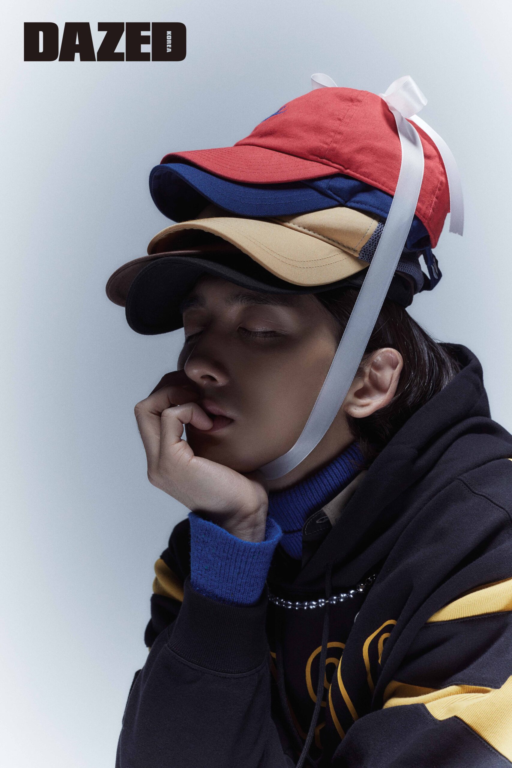 슬리브리스 셔츠는 버버리(Burberry), 레이어링한 블랙 레터링 후디는 구찌(Gucci), 블루 컬러 터틀넥 톱은 코치 1941(Coach 1941), 실버 로고 코인 네크리스는 돌체앤가바나(Dolce&Gabbana), 레드 컬러 로고 볼캡과 블루 컬러 로고 볼캡은 나이키(Nike), 메시 볼캡과 브라운 컬러의 볼캡은 에디터의 것.