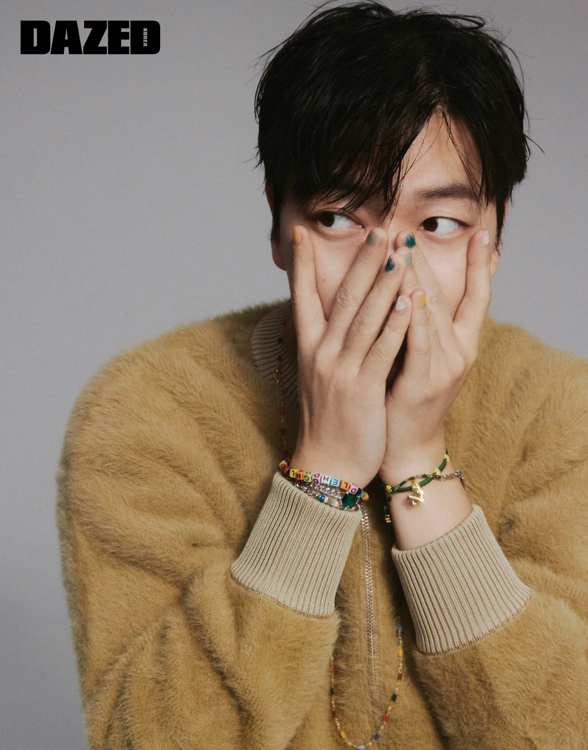 컬러 비즈 네크리스와 알파벳 브레이슬릿, 체인 브레이슬릿, ‘Flower Power’, ‘Dream Green’ 비즈 브레이슬릿은 모두 아베크띵(Avecthing), 터틀넥 집업 재킷은 동휘의 것.