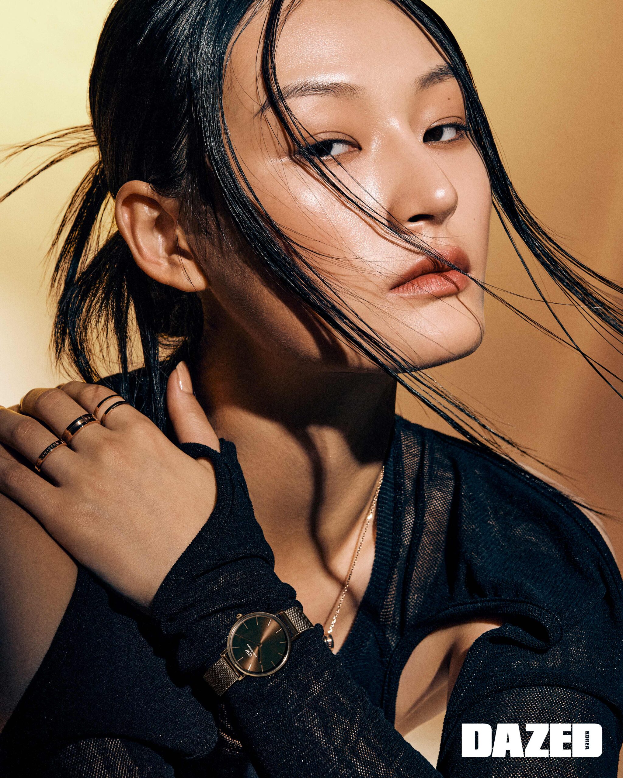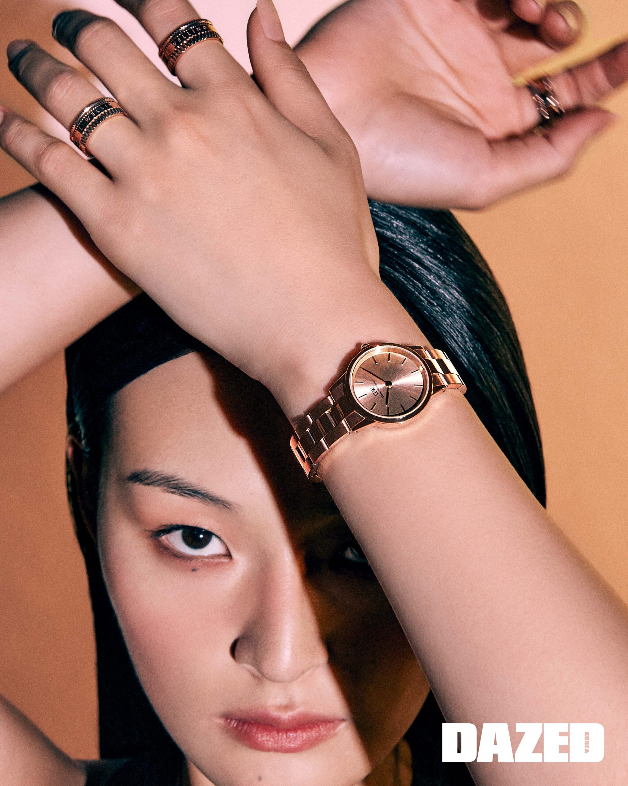 다이얼과 브레이슬릿의 컬러가 동일해 차분한 느낌인 아이코닉 링크 유니톤 로즈 골드 워치(ICONIC LINK UNITONE ROSEGOLD)와 레이어링한 엘리베이션 링(ELEVATION RING)은 다니엘 웰링턴(DANIEL WELLINGTON).