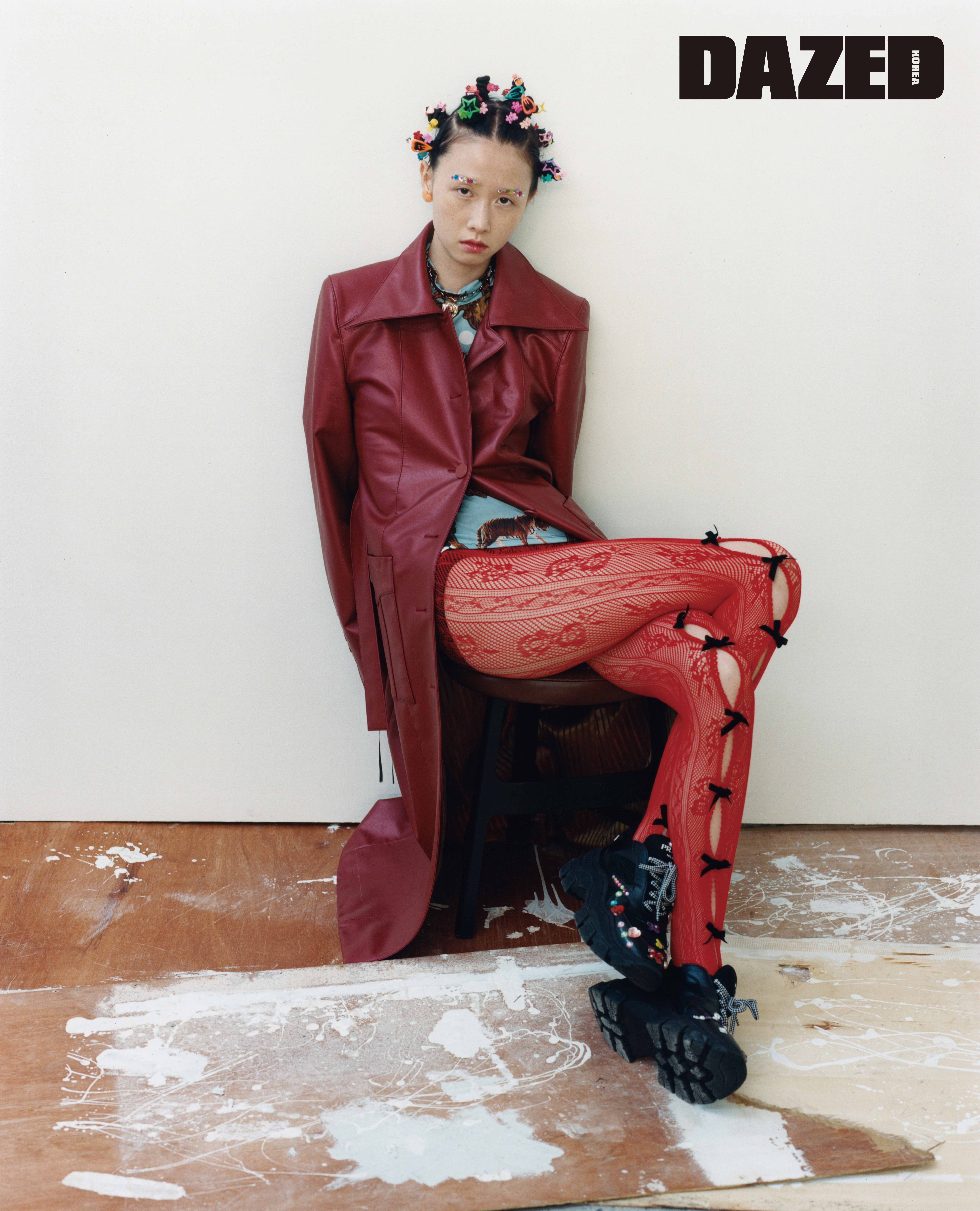 레더 롱 코트와 애니멀 프린트 터틀넥 톱은 비건타이거(Vegan Tiger), 리본 디테일 스타킹은 노 드레스(No Dress), 펜던트 네크리스는 믹시마이(Mikshimai), 스니커즈는 일명의 것.