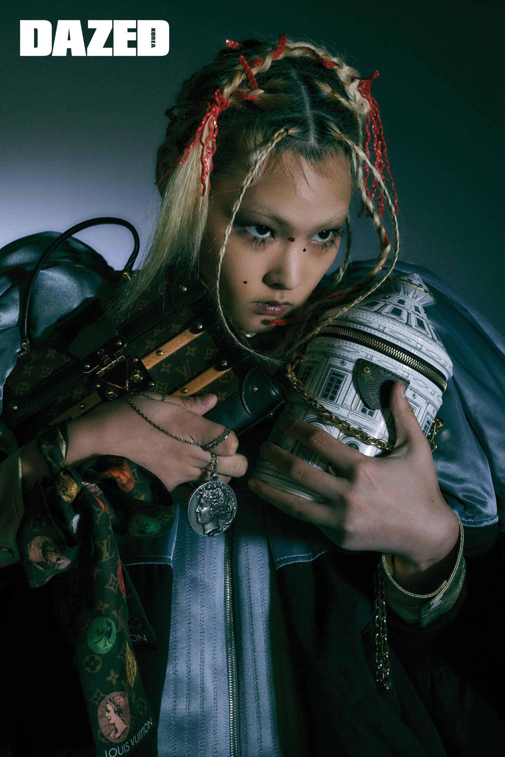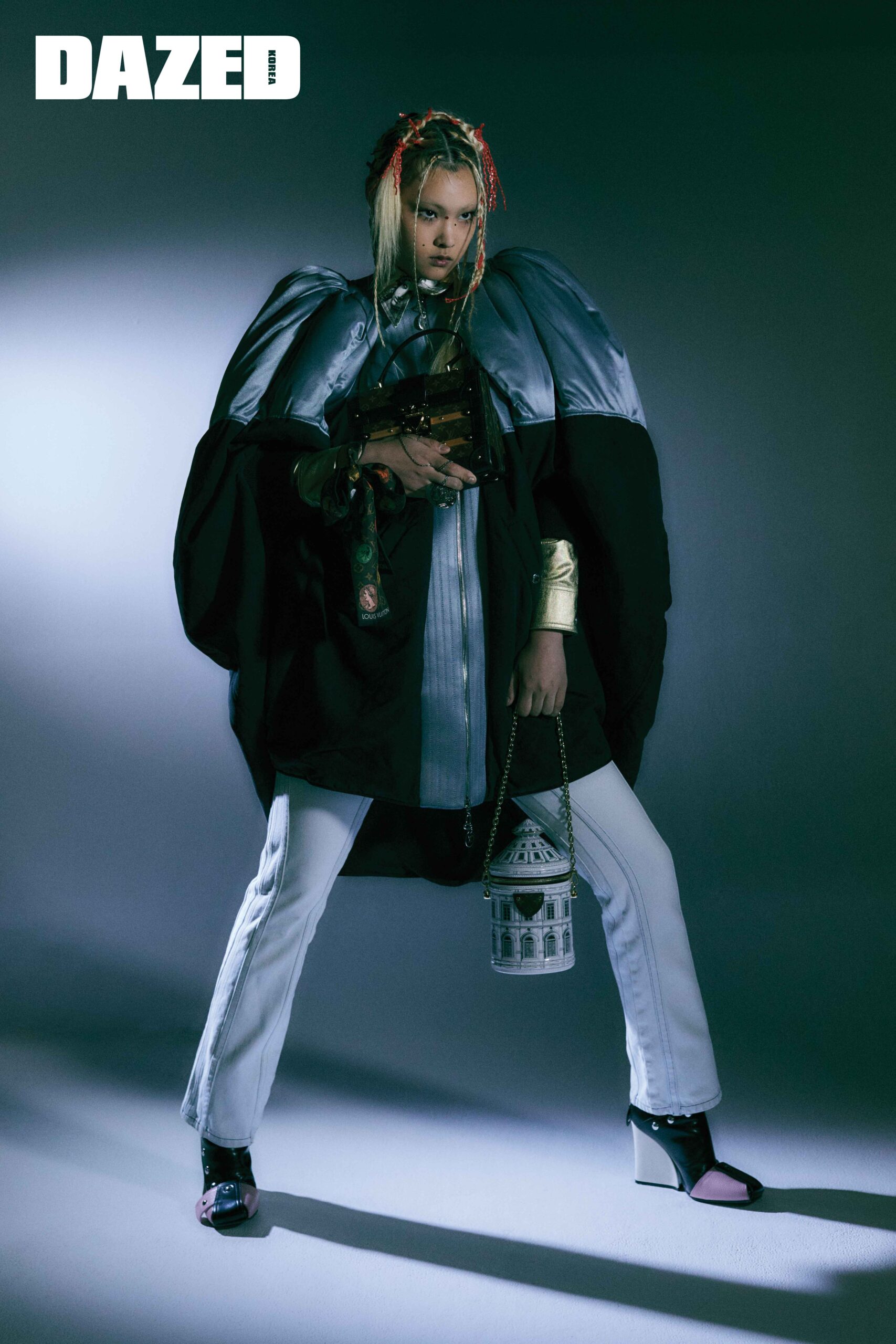 코쿤 재킷과 오버올 데님 팬츠, 컬러 배색이 특징인 부츠, 손목에 연출한 모노그램 패턴 까메오 방도, 손에 쥔 까메오 코인 네크리스, 원통 모양 깐느 백, 모노그램 패턴의 트리아논 백은 모두 루이 비통(Louis Vuitton).