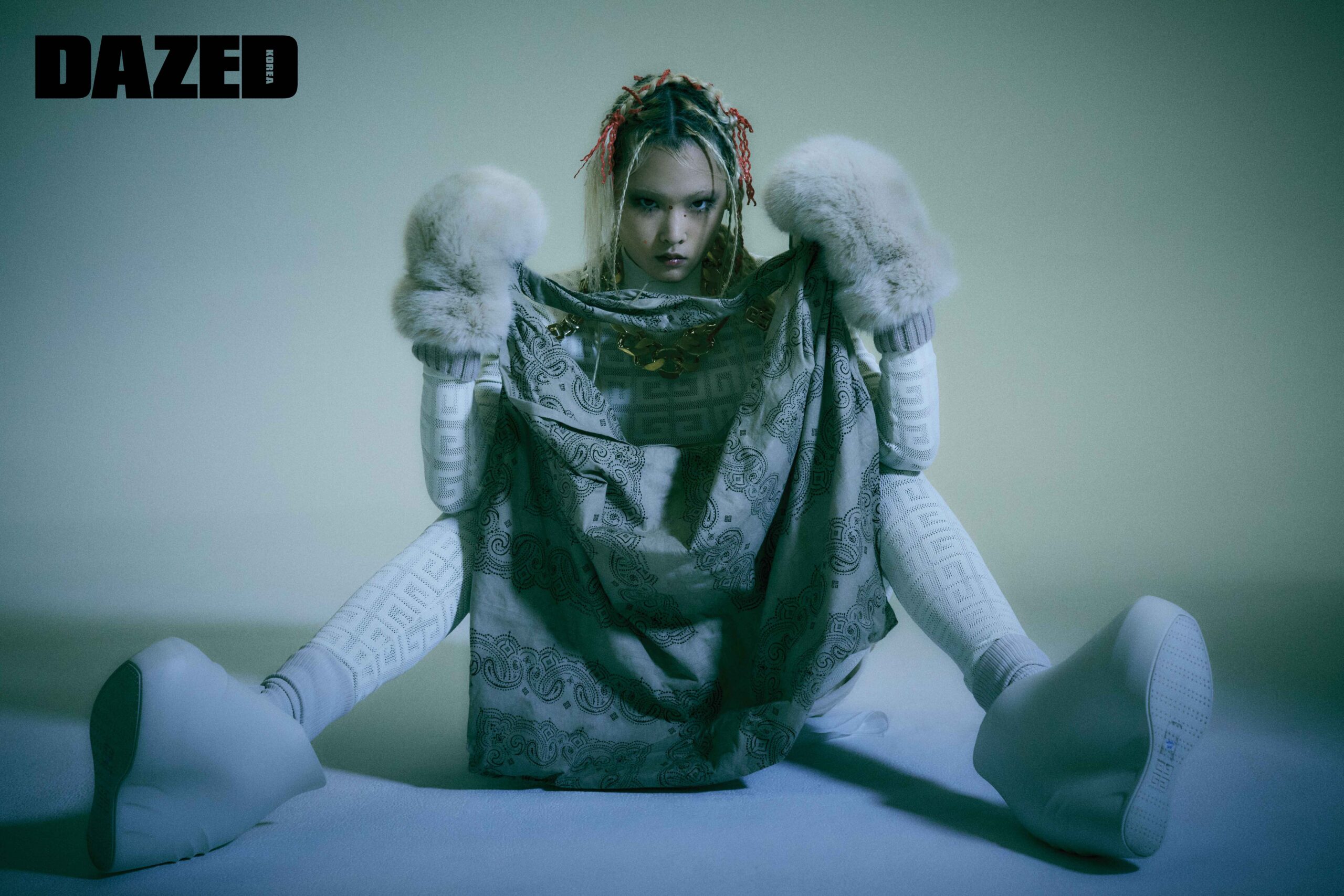 4G 모노그램 톱, 4G 모노그램 레깅스, 레이어링한 비대칭 스커트, 체인 스트랩 디테일 토트백, 체인 라지 네크리스, 퍼 글러브, 쇼 웨지 앵클 슈즈는 모두 지방시(Givenchy).
