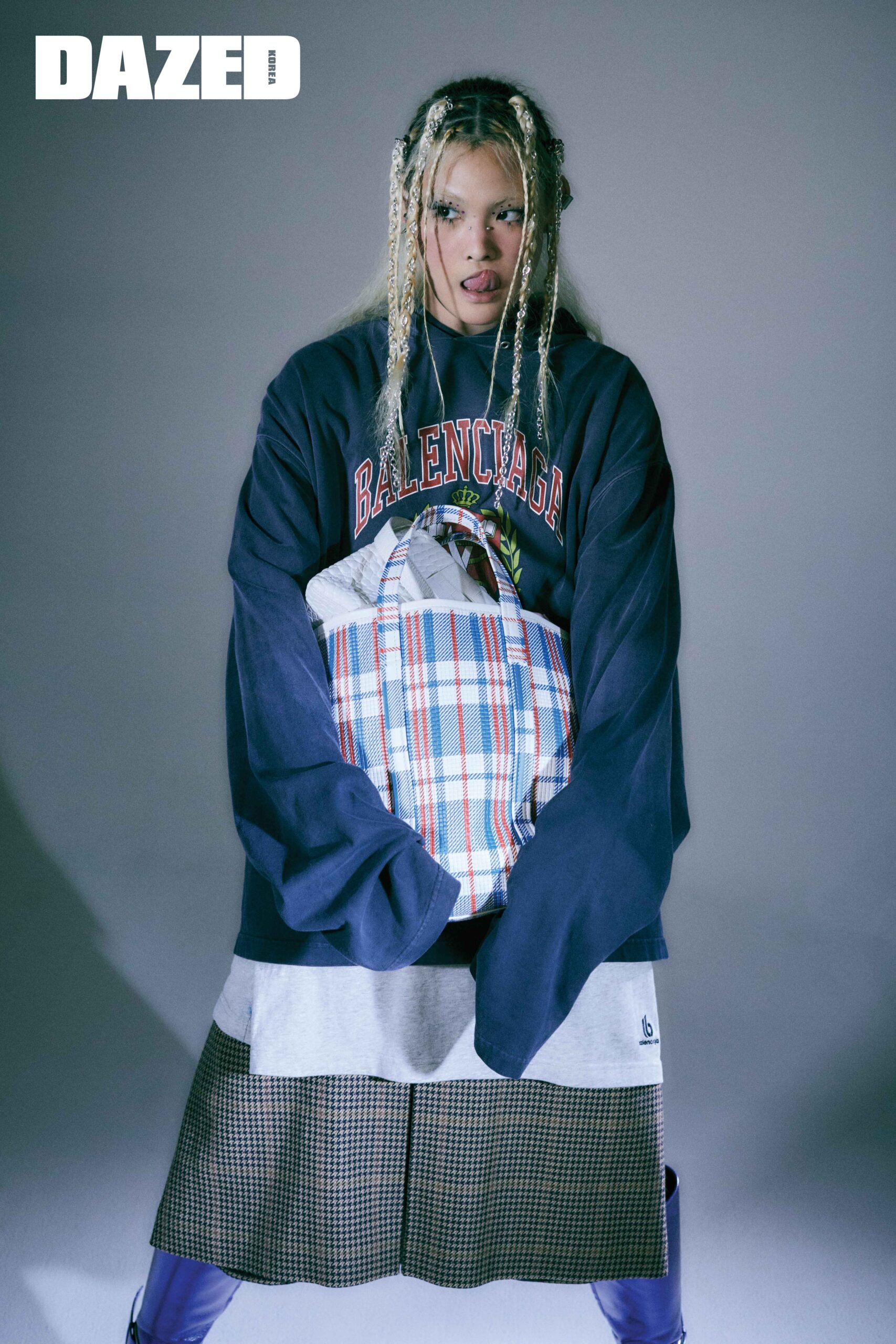 후드 티셔츠와 이너로 레이어링한 오버사이즈 그레이 티셔츠, 플랫 박스 플리츠스커트, 퍼플 부츠, 포스 바 이어링, 클립 이어 커프, 바흐브 쇼퍼 백, 쇼퍼 백 안에 들어 있는 화이트 다운타운 백은 모두 발렌시아가(Balenciaga).