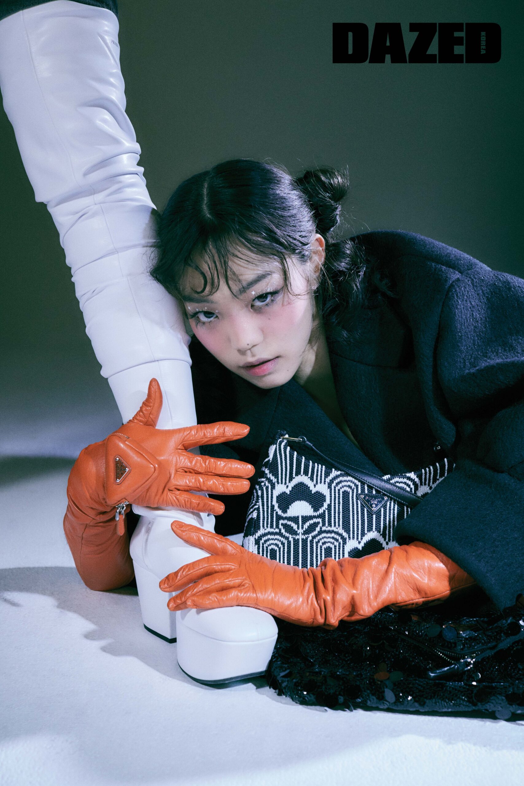 롱 코트와 레더 플랫폼 부츠, 코인 포켓 디테일 오렌지 글러브, 비즈 시퀸 백, 자카르 호보백은 모두 프라다(Prada).