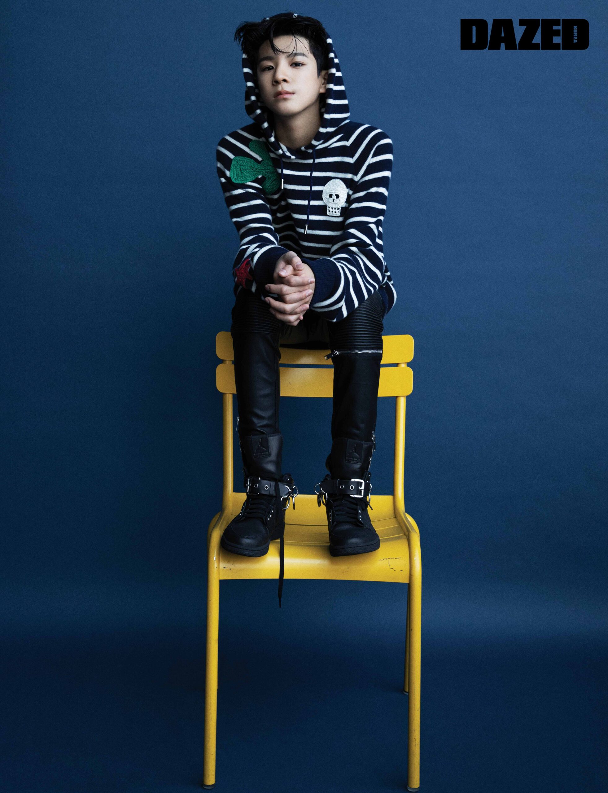 스트라이프 패턴 후드 니트 풀오버는 알렉산더 맥퀸(Alexander McQueen), 레더 바이크 팬츠와 슈즈는 에디터의 것.