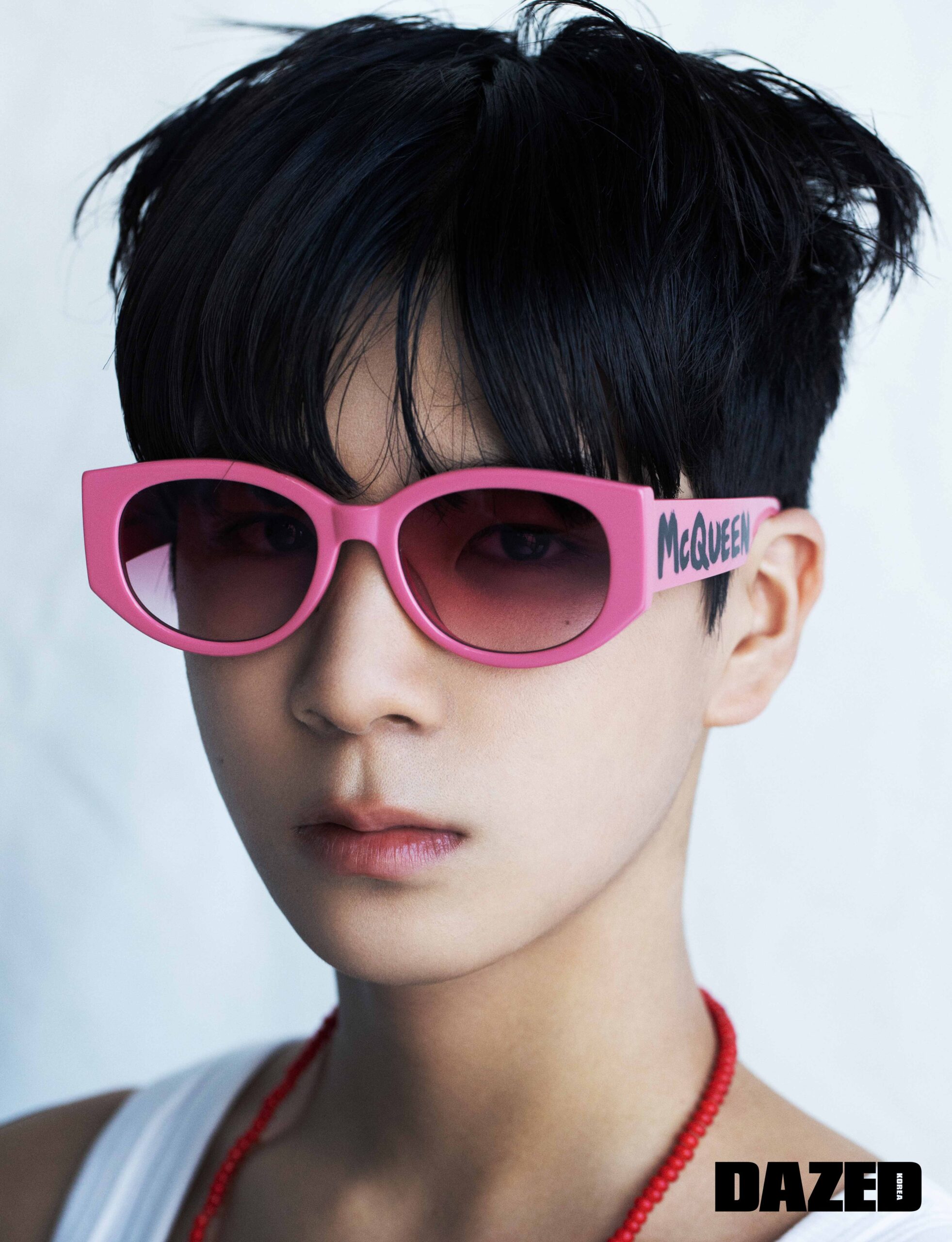 핑크 컬러 선글라스는 알렉산더 맥퀸(Alexander McQueen), 톱과 네크리스는 에디터의 것.