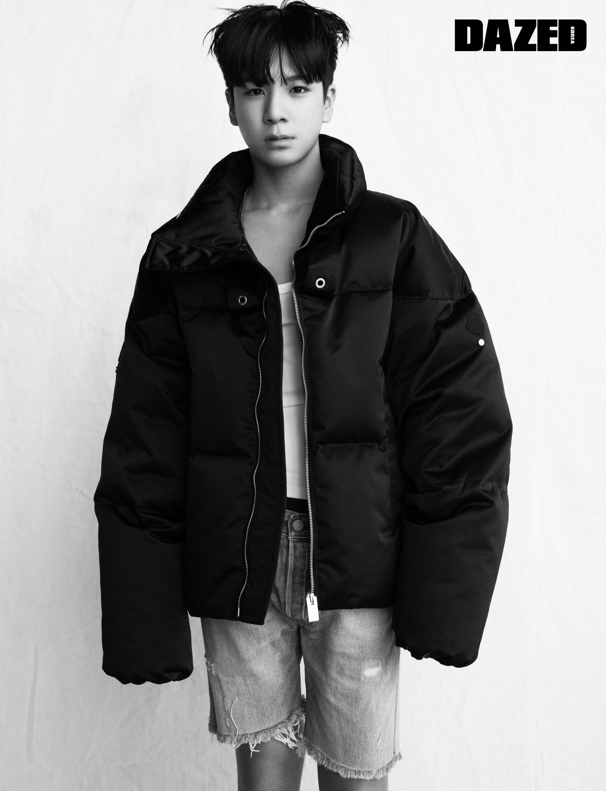 블랙 컬러 패딩 재킷은 6 몽클레르 1017 알릭스 95M(6 Moncler 1017 Alyx 95M), 톱과 데님 쇼츠는 에디터의 것.