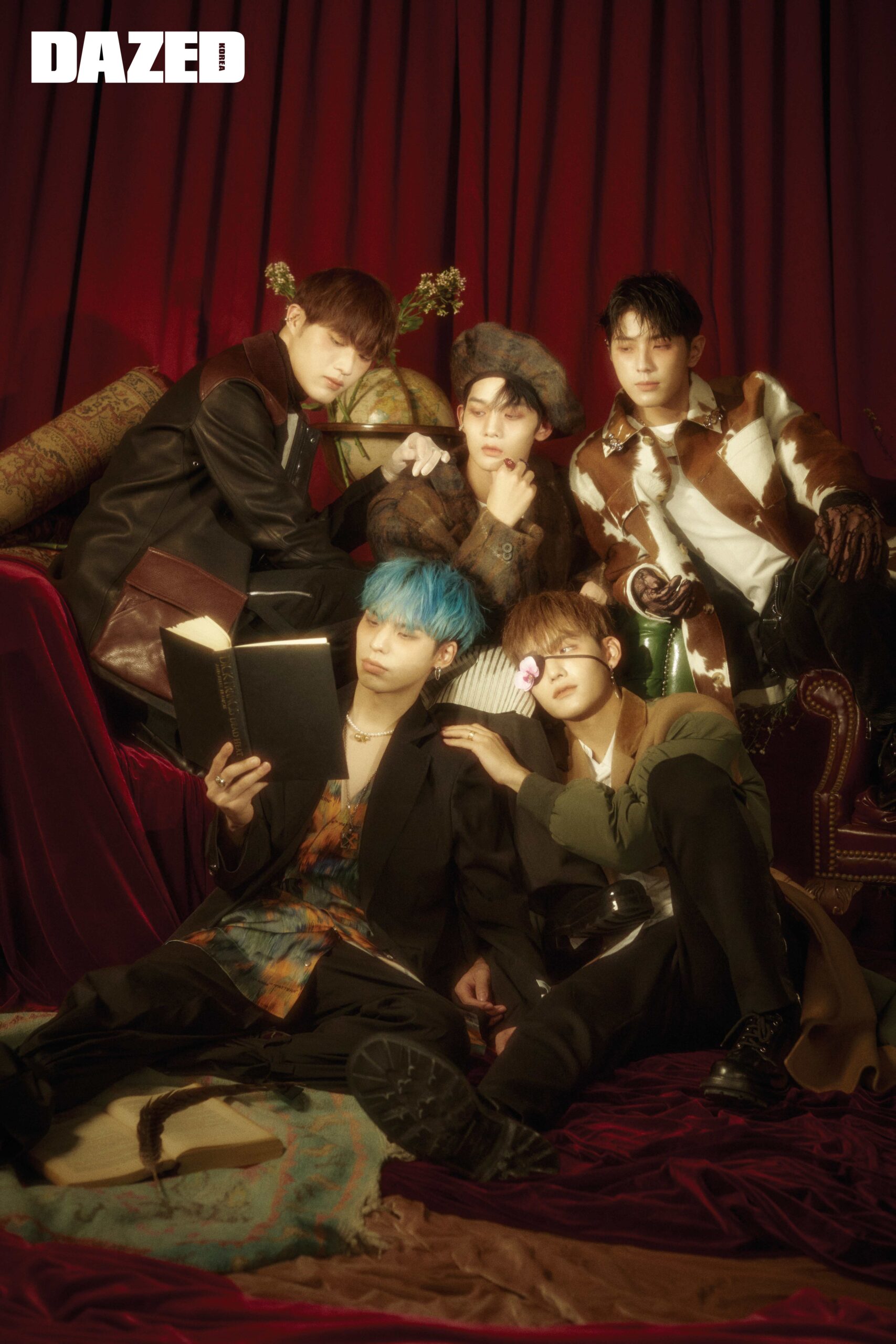 현석이 입은 코듀로이 칼라 레더 재킷은 토즈(Tod’s), 레이스 터틀넥 톱은 (Neul), 이어 커프는 포트레이트 리포트(Portrait Report), 오간자 소재 글러브는 에디터의 것. BX가 입은 재킷은 오프화이트(Off-White™), 펄 네크리스는 포트레이트 리포트(Portrait Report), 체인 디테일 이어링은 트렌카디즘(Trencadism). 배진영이 입은 체크 크롭트 재킷과 화이트 톱, 체크 베레모는 모두 아더에러(Ader), 플라워 링은 다나버튼(Dana Burton). 용희가 입은 송치 재킷은 네이비 by 비욘드클로젯(Navy by Beyond Closet), 체인 네크리스와 칼라에 부착한 헤어핀은 드와떼(Doigté), 레이스 글러브는 에디터의 것. 승훈이 입은 배색 코트와 화이트 셔츠는 알렉산더 맥퀸(Alexander McQueen), 지오메트릭 커팅 링은 믹시마이(Mikshimai), 안대와 이어링은 에디터의 것.