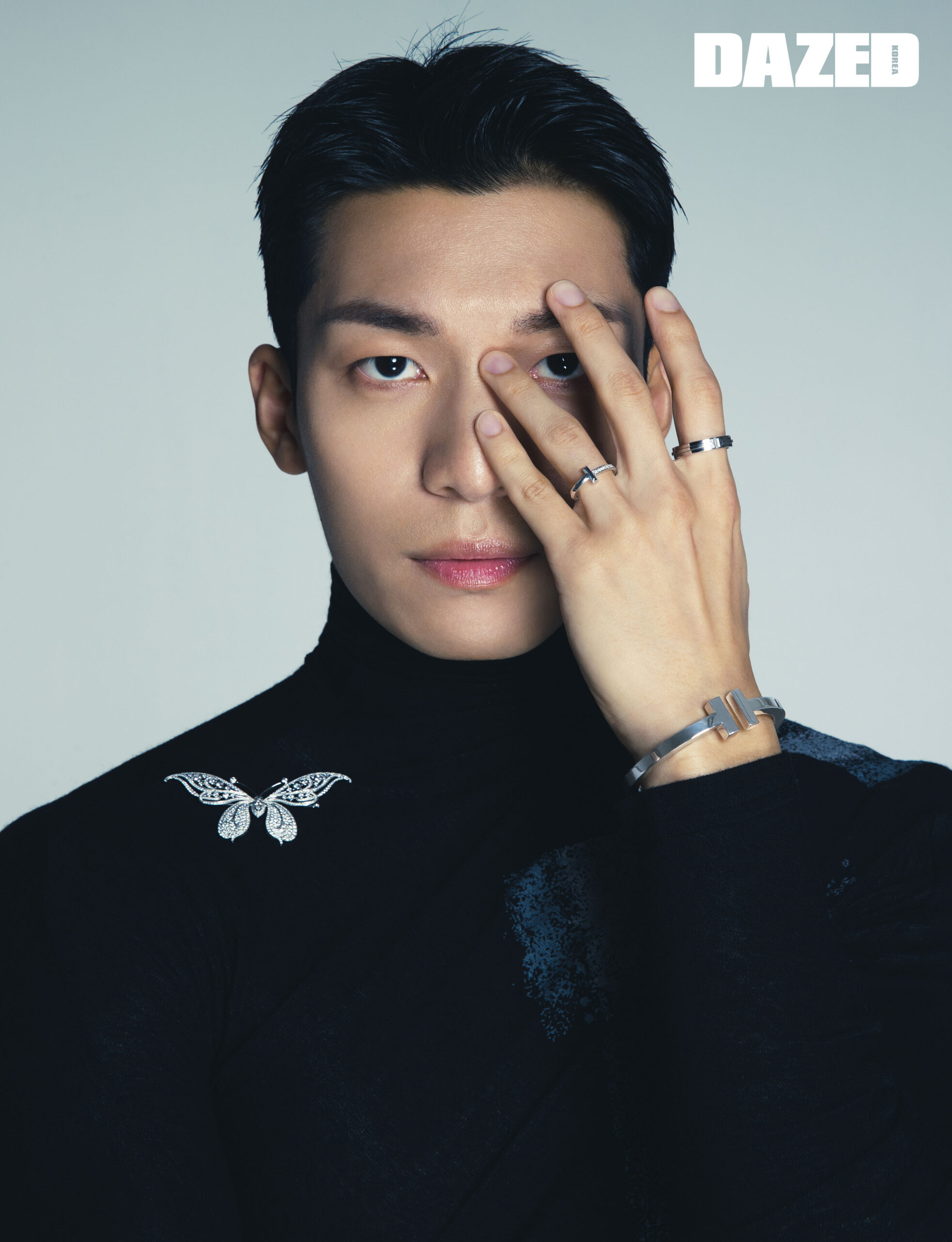 플래티늄 소재에 2.62캐럿의 라운드 브릴리언트 다이아몬드를 세팅한 티파니 인챈트 버터플라이 브로치, 18K 화이트 골드 소재의 티파니 T1 내로우 하프 다이아몬드 링과 티파니 T 투 링, 그리고 T의 수직적인 디자인이 돋보이는 티파니 T 스퀘어 브레이슬릿은 모두 티파니(Tiffany & Co.), 블랙 드레이프 터틀넥 톱은 혜인서(Hyein Seo).