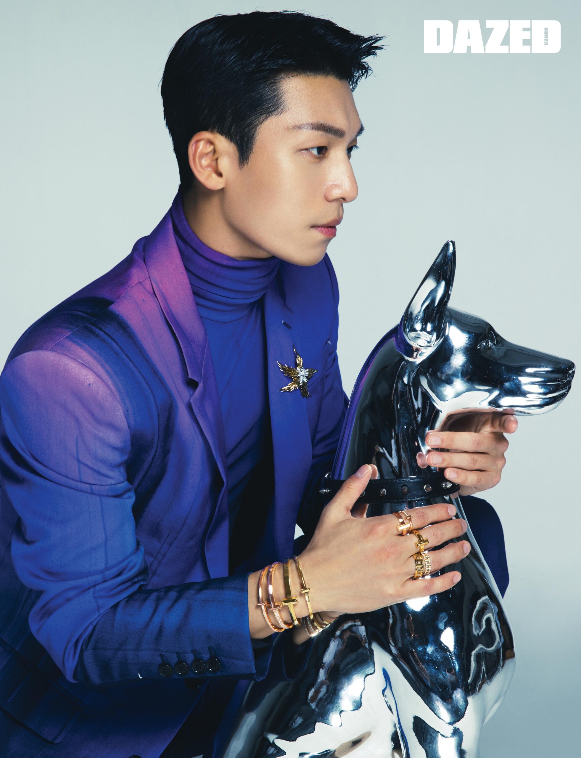 플래티늄과 18K 옐로우 골드 소재에 1.30 캐럿의 라운드 브릴리언트 다이아몬드가 세팅된 티파니 슐럼버제 파리 플레임 다이아몬드 브로치, 티파니 T 트루 8MM 링, 라운드 브릴리언트 다이아몬드가 세팅된 티파니 T 트루 파베 와이드 링, 티파니 T1 와이드 힌지드 뱅글, 티파니 T1 내로우 힌지드 뱅글 그리고 티파니 T1 와이드 링, 18K 로즈 골드 소재의 라운드 브릴리언트 다이아몬드가 세팅된 티파니 T1 와이드 하프 다이아몬드 힌지드 뱅글과 티파니 T1 내로우 하프 다이아몬드 힌지드 뱅글, T1 와이드 힌지드 뱅글, 티파니 T1 와이드 링, 그리고 라운드 브릴리언트 다이아몬드가 세팅된 티파니 T1 내로우 하프 다이아몬드 링은 모두 티파니(Tiffany & Co.), 슈트와 터틀넥 톱은 벨루티(Berluti).