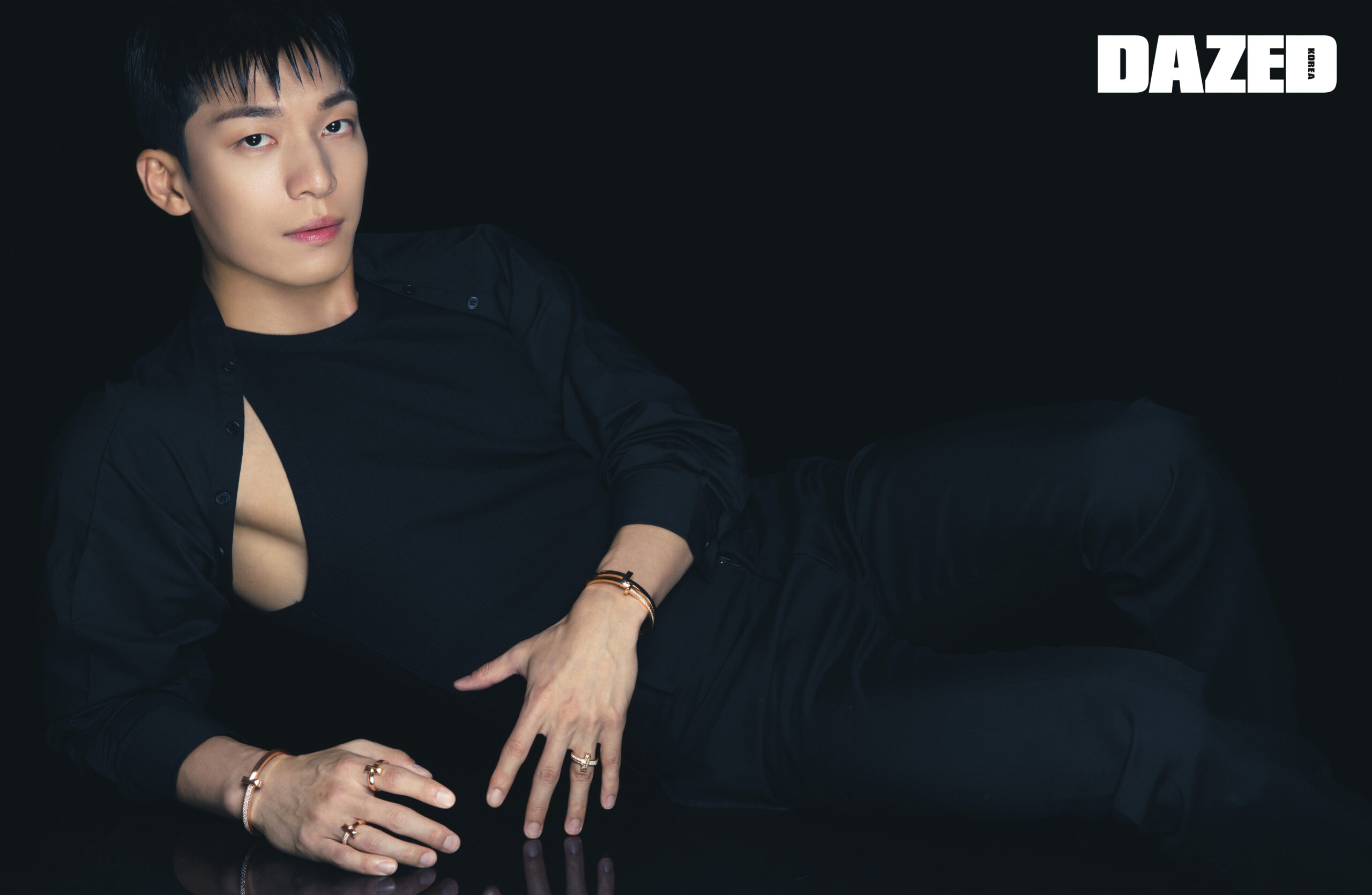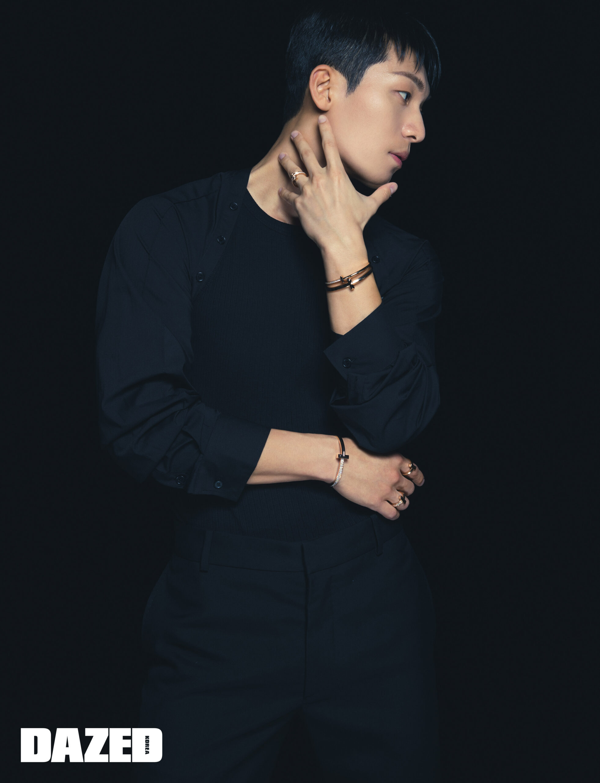 18K 로즈 골드 소재의 티파니 T1 와이드 하프 다이아몬드 힌지드 뱅글과 티파니 T1 내로우 하프 다이아몬드 힌지드 뱅글, 티파니 T1 와이드 힌지드 뱅글, 라운드 브릴리언트 다이아몬드가 세팅된 티파니 T1 와이드 풀 다이아몬드 링, 라운드 브릴리언트 다이아몬드가 세팅된 티파니 T1 와이드 하프 다이아몬드 링, 그리고 티파니 T1 와이드 링은 모두 티파니(Tiffany & Co.), 블랙 볼레로와 슬리브리스 톱은 머스트고온(Mgo), 팬츠는 스타일리스트의 것.