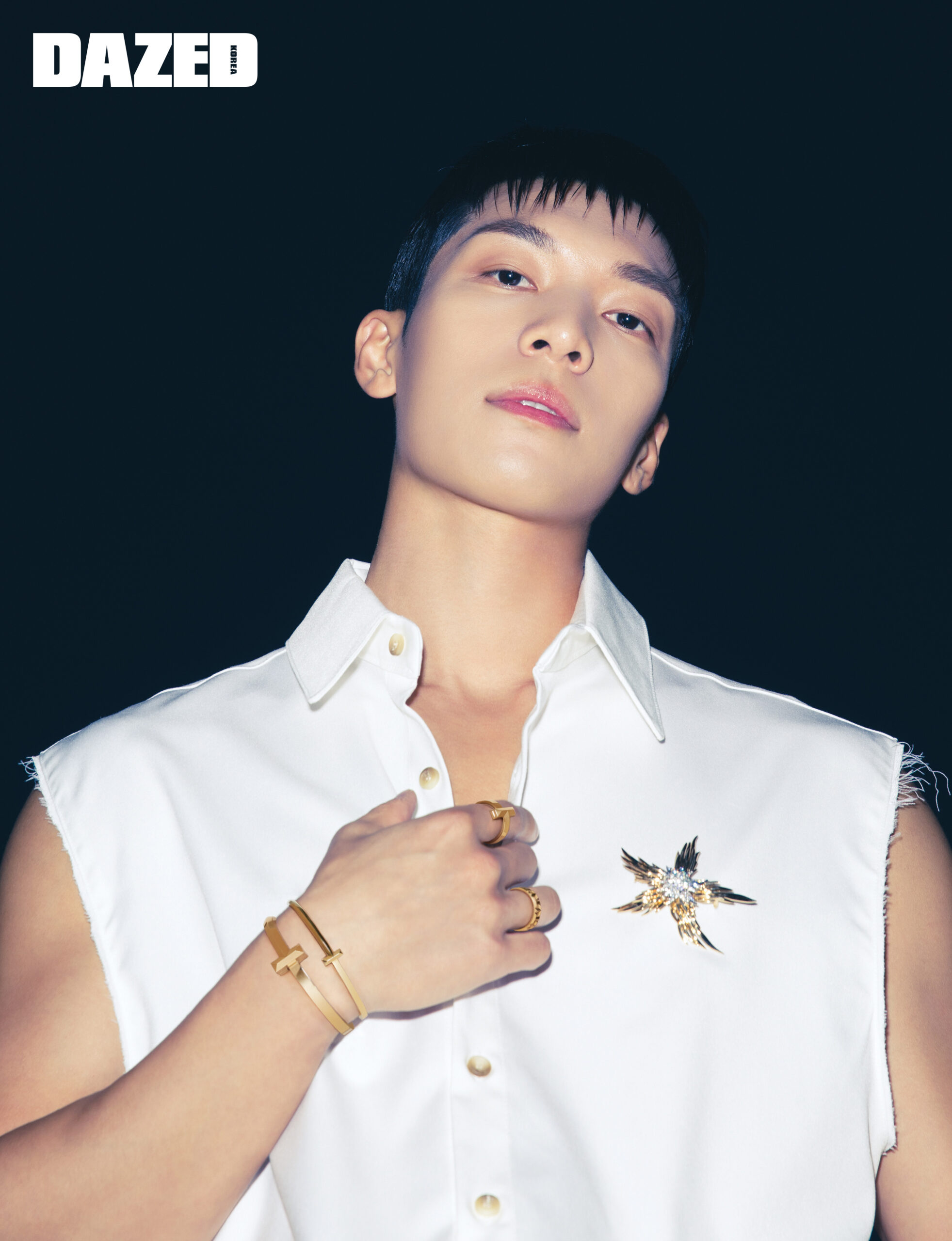 플래티늄과 18K 옐로우 골드 소재에 1.30 캐럿의 라운드 브릴리언트 다이아몬드가 더해진 티파니 슐럼버제 파리 플레임 다이아몬드 브로치, 18K 옐로우 골드 소재의 티파니 T1 와이드 힌지드 뱅글과 티파니 T1 내로우 힌지드 뱅글, 티파니 T1 와이드 링, 티파니 T 트루 8MM링, 그리고 라운드 브릴리언트 다이아몬드가 세팅된 티파니 T트루 파베 와이드링은 모두 티파니(Tiffany & Co.), 화이트 슬리브리스 셔츠는 스타일리스트의 것.