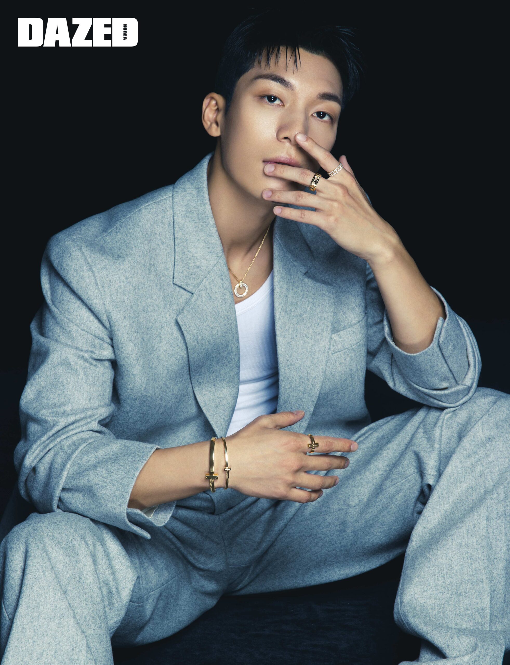 18K 옐로우 골드 소재의 티파니 T1 서클 펜던트, 티파니 T1 와이드 힌지드 뱅글, 티파니 T1 내로우 힌지드 뱅글, 티파니 T1 와이드 링, 티파니 T 트루 8MM 링, 그리고 라운드 브릴리언트 다이아몬드가 세팅된 티파니 T 트루 파베 와이드 링은 모두 티파니(Tiffany & Co.), 그레이 슈트는 오프화이트(Off-White™), 슬리브리스 톱은 스타일리스트의 것.