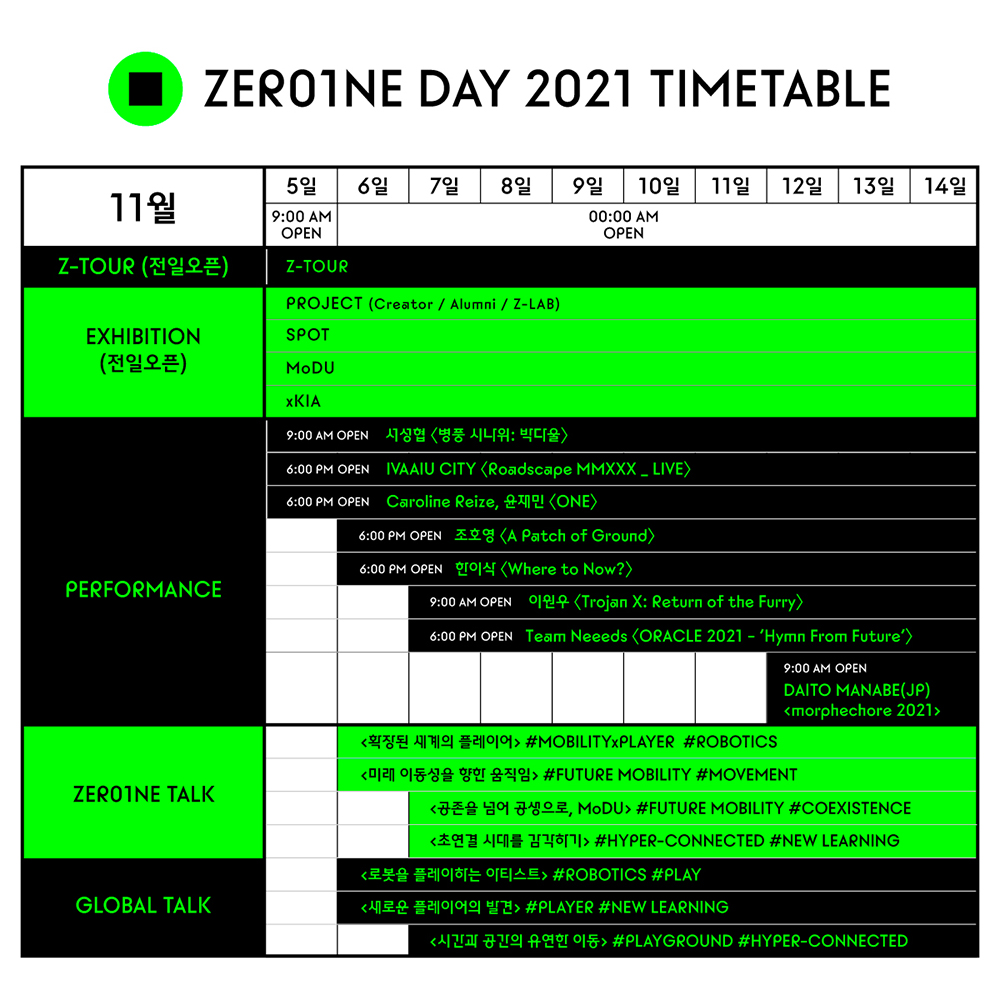 한편, 사운드 비주얼 아트 퍼포먼스와 행위 퍼포먼스 그리고 토크 섹션 등 국내외 아티스트가 참여하는 다채로운 프로그램들을 통해 색다른 즐거움도 제공할 예정이다. 10일간 지속되는 온라인 전시를 더욱 현장감 있도록 즐기고 싶다면 시시각각 올라오는 개별 콘텐츠 일정을 확인하자. 예술과 기술을 아우르고 온라인 전시를 통해 영구적으로 거듭난 2021 제로원데이는 온라인을 통해 누구나 무료 입장 및 관람이 가능하며 홈페이지(www.zer01neday.com) 와 SNS를 통해 더 자세한 정보를 확인할 수 있다.