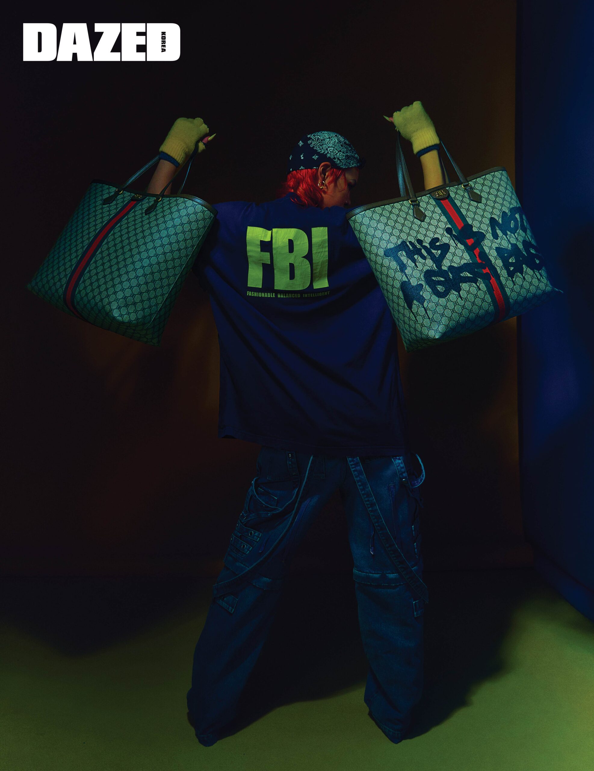 FBI 프린트 티셔츠와 레이버 팬츠, 볼 이어링, 왼손에 든 더 해커 프로젝트 라지 에보니 토트백, 오른손에 든 더 해커 프로젝트 그라피티 라지 에보니 토트백은 모두 발렌시아가(Balenciaga).