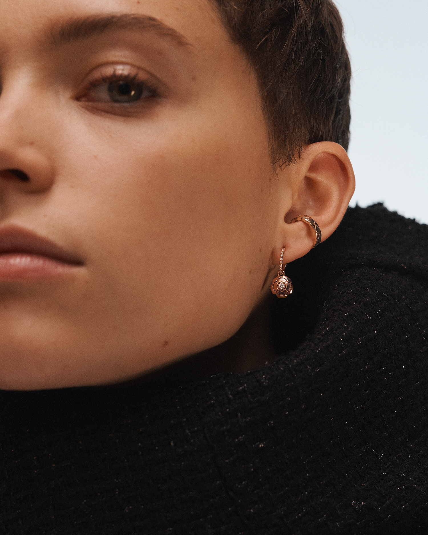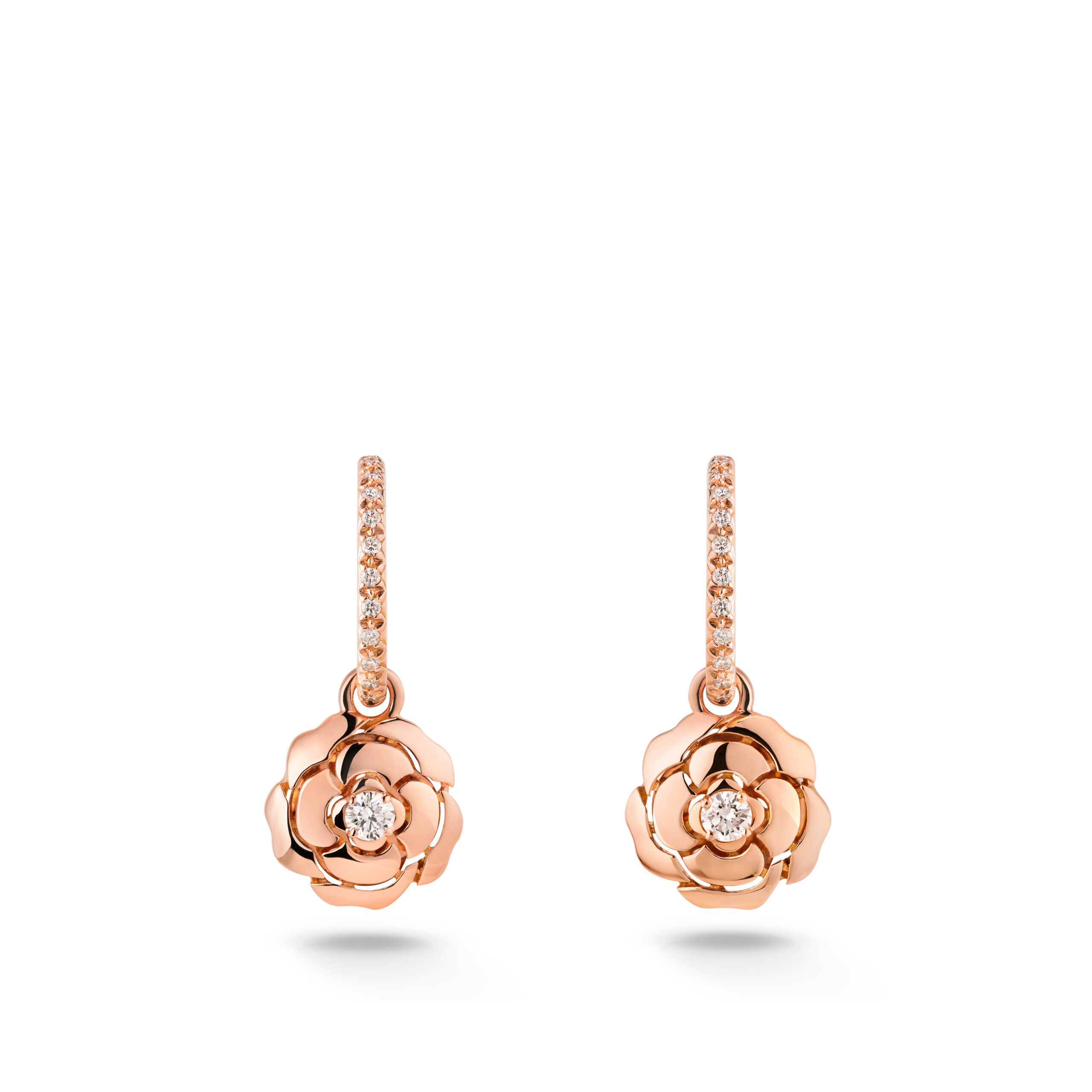 18K 핑크 골드와 다이아몬드로 이루어진 익스트레 드 까멜리아 이어링 샤넬(Chanel).