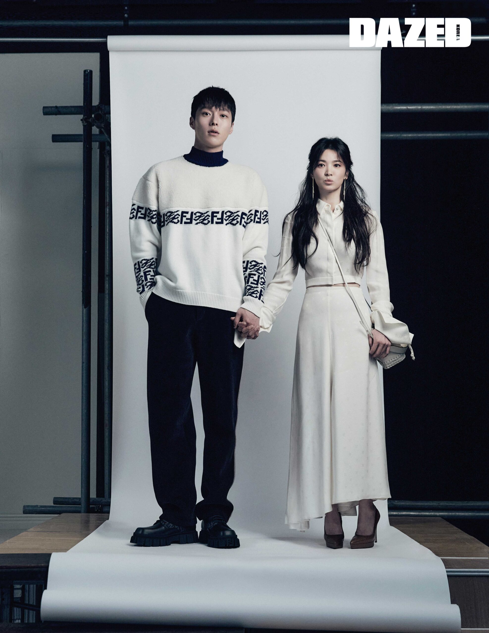 기용이 입은 로고 포인트 배색 터틀넥 톱과 라이닝 디테일 코듀로이 팬츠, 아웃솔이 돋보이는 블랙 로고 펜디 포스 레이스업 슈즈는 펜디(Fendi). 혜교가 입은 실크 크롭트 셔츠와 언밸런스드 스커트, 화이트 몬트레조 백은 모두 펜디(Fendi), 이어링과 힐은 스타일리스트의 것.