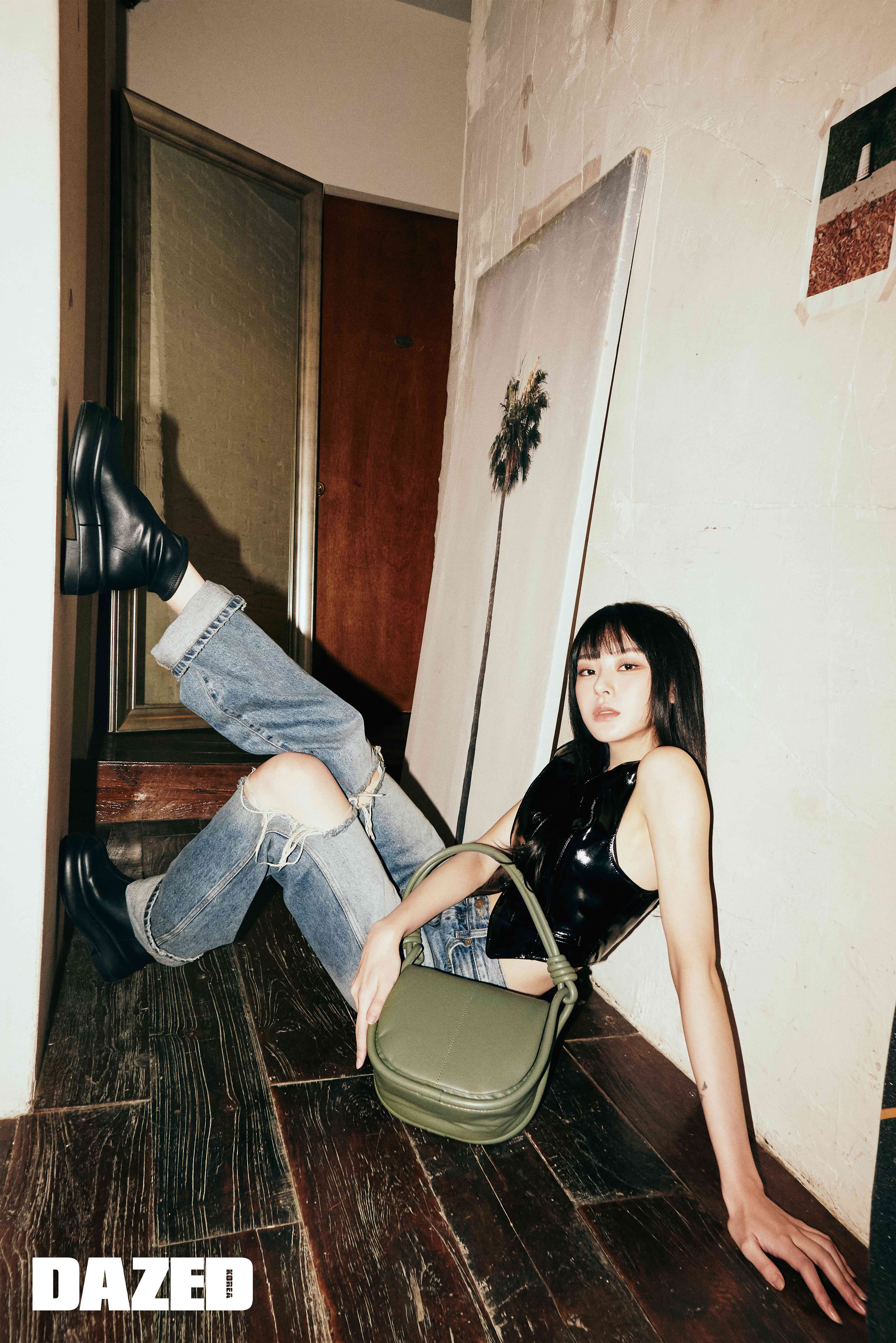 에나멜 베스트는 수기(Su Gi), 올리브 컬러 숄더백과 슬립온 앵클부츠는 찰스앤키스(CHARLES & KEITH), 빈티지한 데님 팬츠는 스타일리스트의 것.
