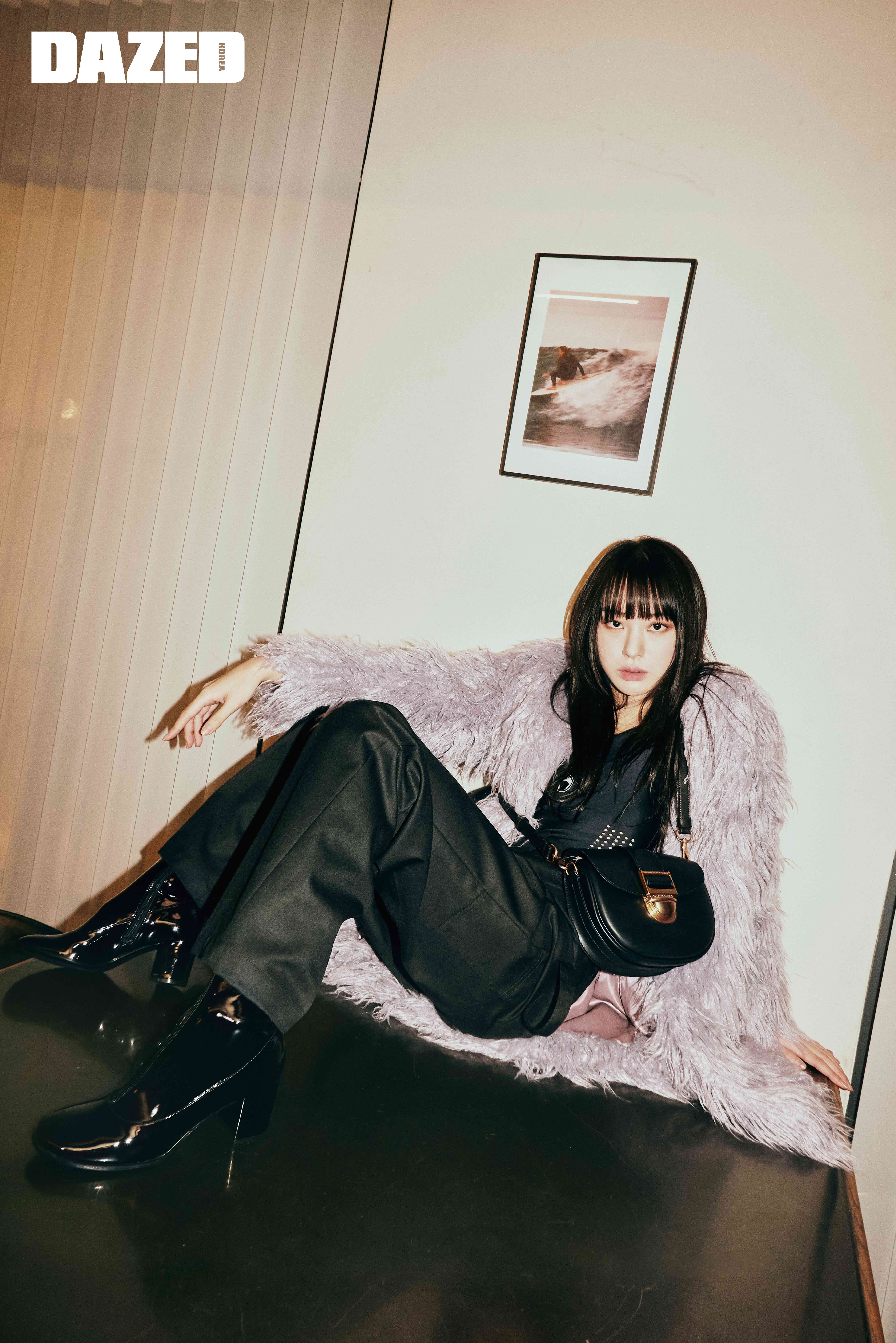퍼플 컬러 퍼 재킷은 앤디아더(Andtheother), 보디슈트는 마린세르 by 무이(Marine Serre by MUE), 블랙 슬랙스는 민아송(Minasong), 블랙 크로스 보디 백과 에나멜 앵클부츠는 찰스앤키스(CHARLES & KEITH).
