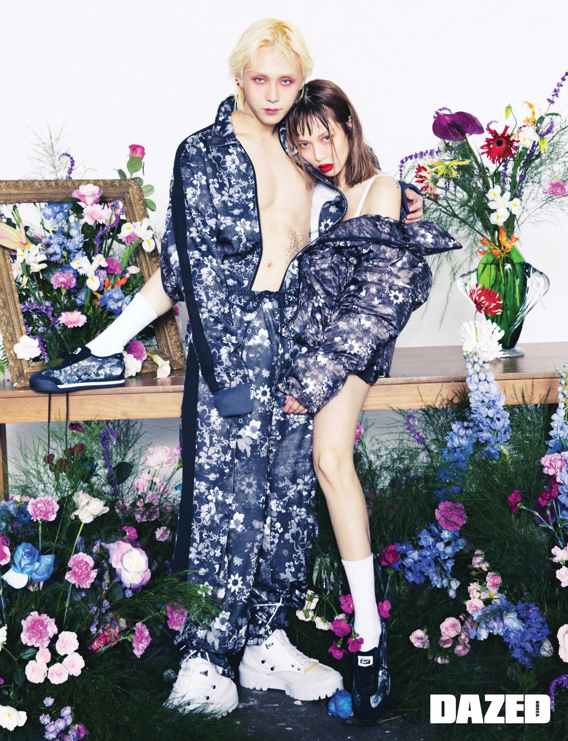 이 입은 플라워 프린트 트랙 재킷과 트랙 팬츠는 오니츠카타이거(Onitsuka Tiger). 현아가 입은 플라워 프린트 다운 재킷은 오니츠카타이거(Onitsuka Tiger).
