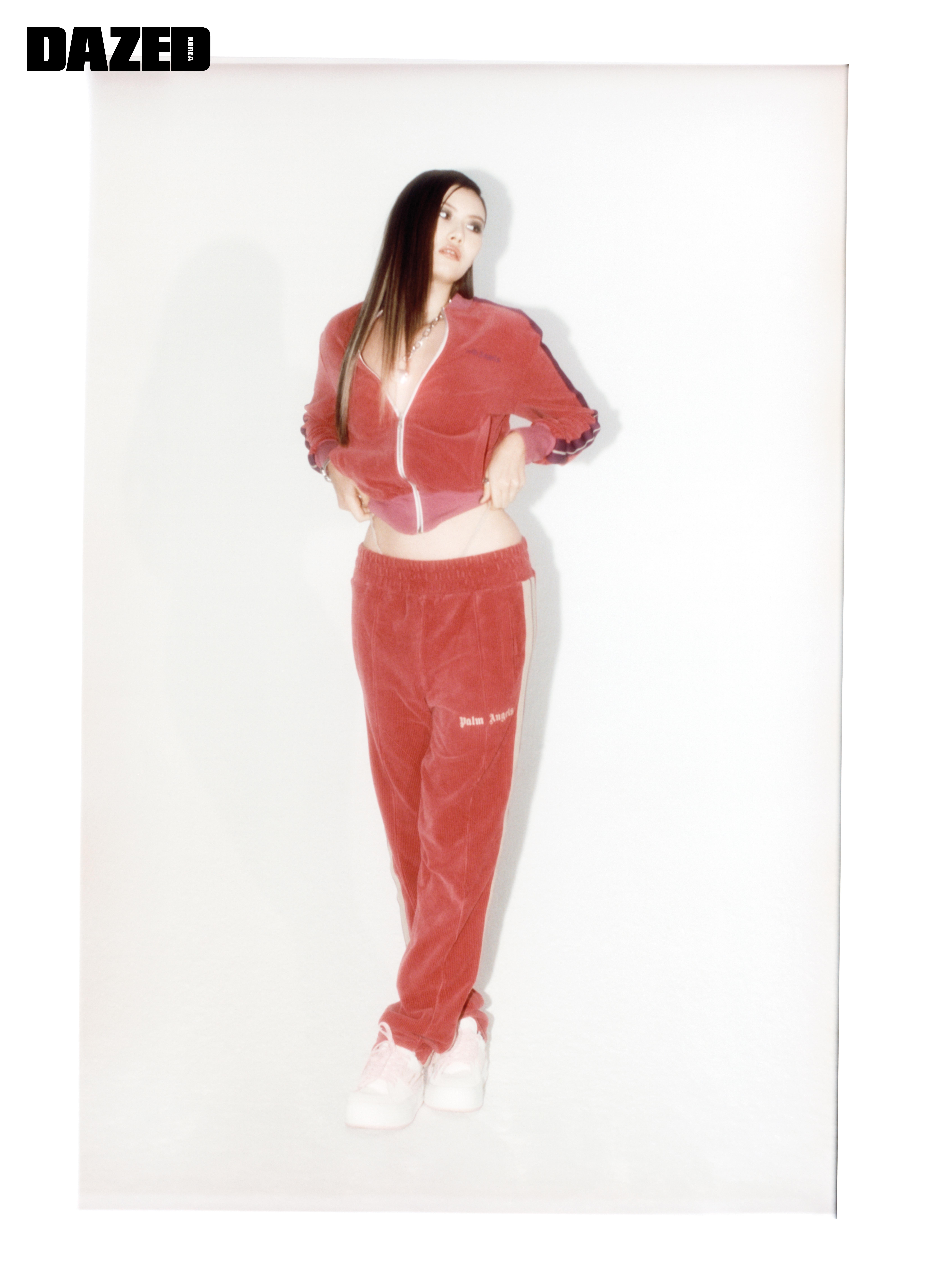코듀로이 소재의 핑크 컬러 트랙 슈트 셋업과 스니커즈, 체인 네크리스는 모두 팜 엔젤스(Palm Angels).