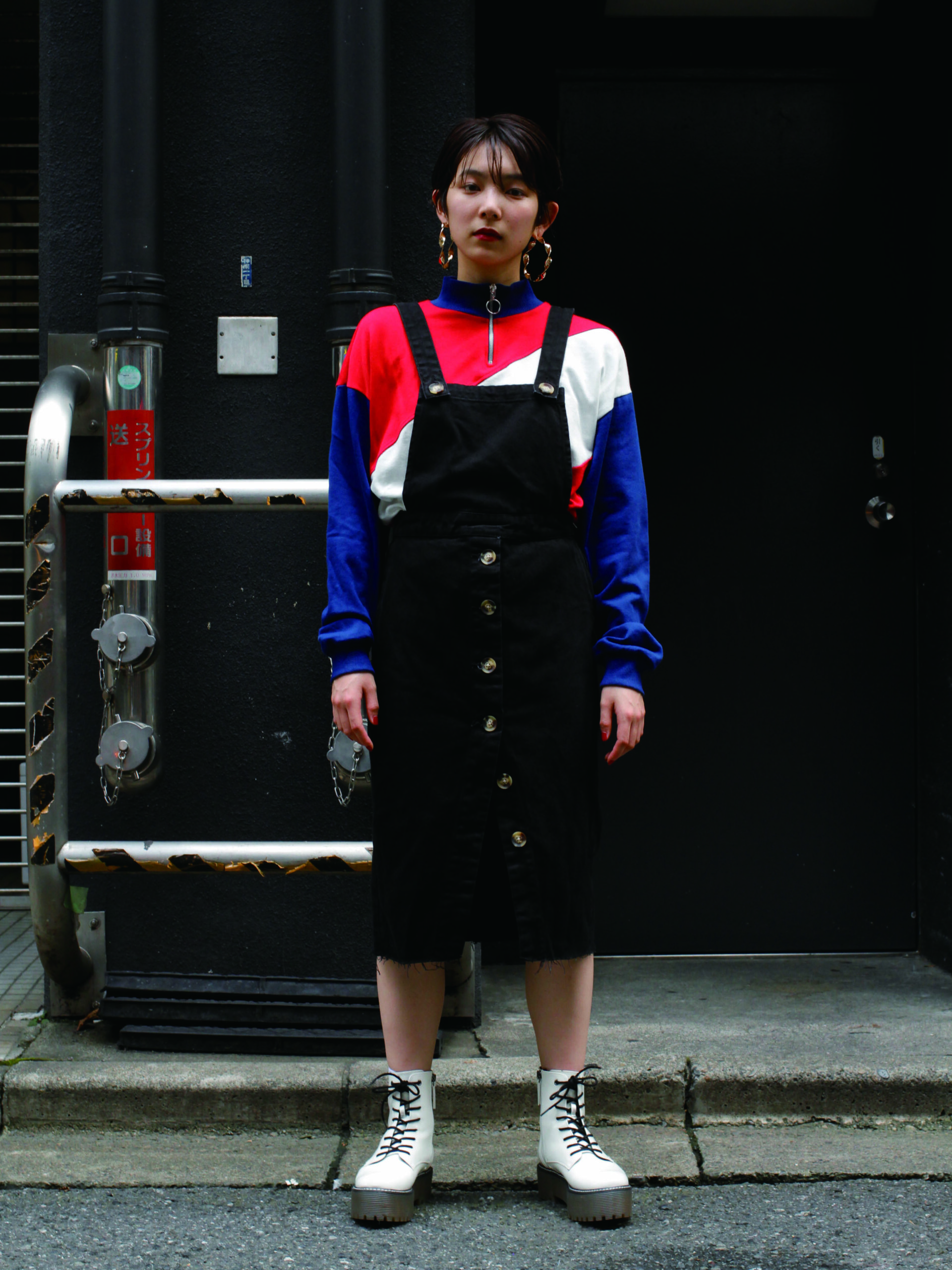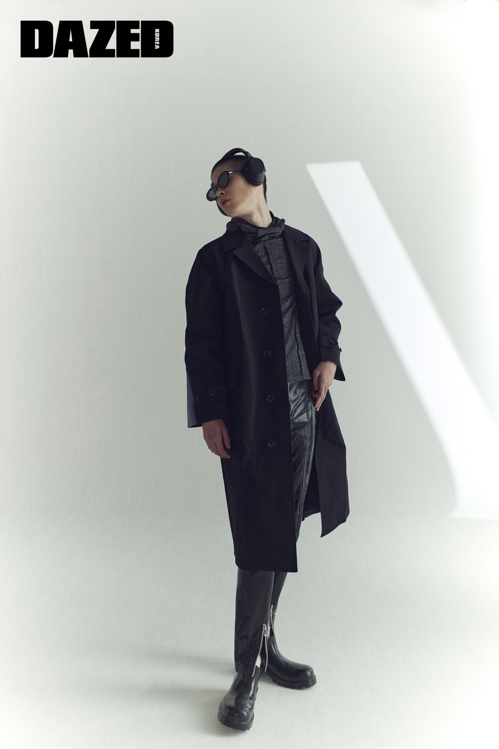 블랙 코튼 코트는 구찌(Gucci), 터틀넥 후드 톱은 라군 1992(Lagoon 1992), 지퍼 디테일 레더 팬츠와 러버 부츠는 보테가 베네타(Bottega Veneta), 캐츠 아이 선글라스는 젠틀몬스터(Gentle Monster).