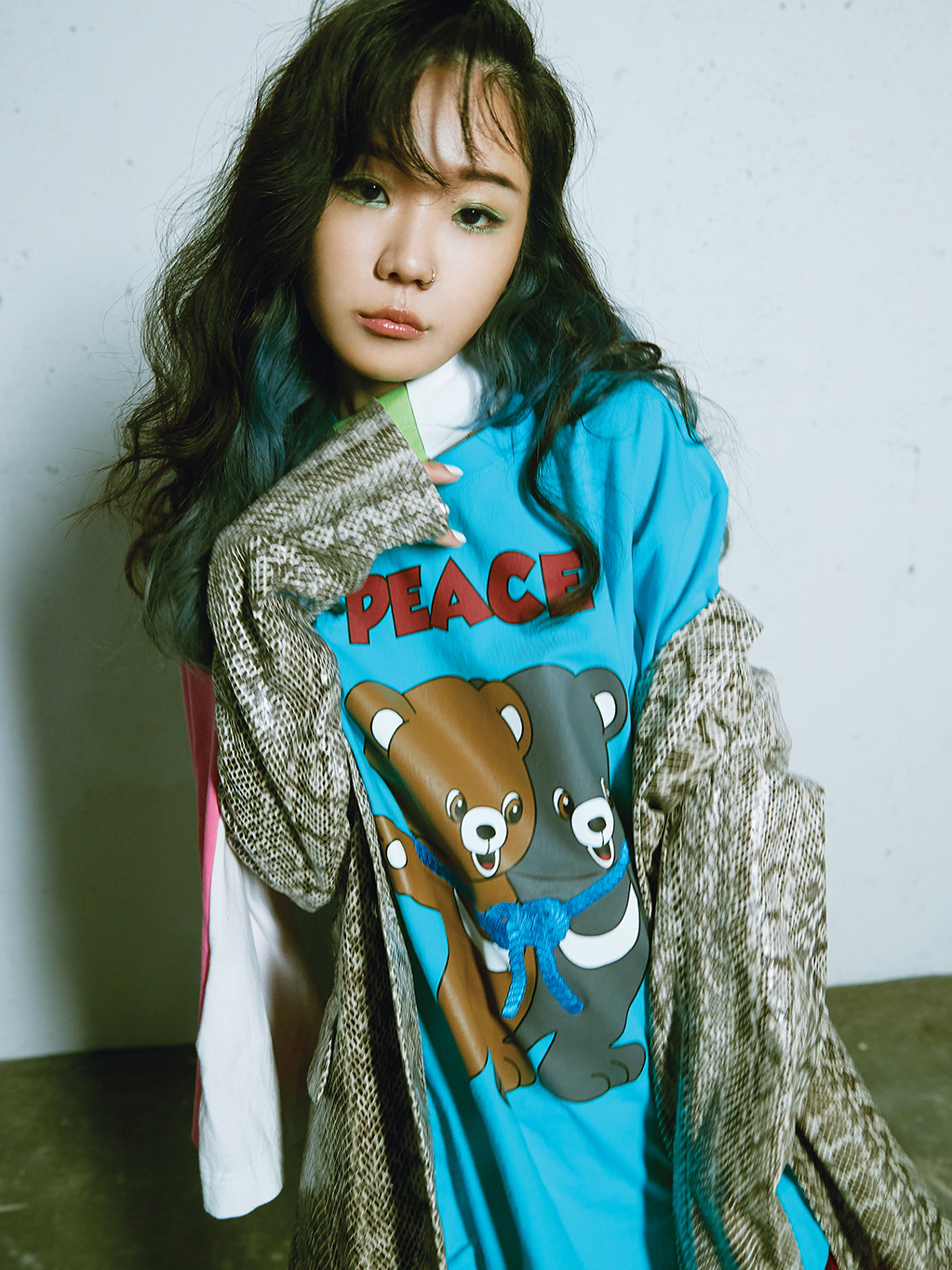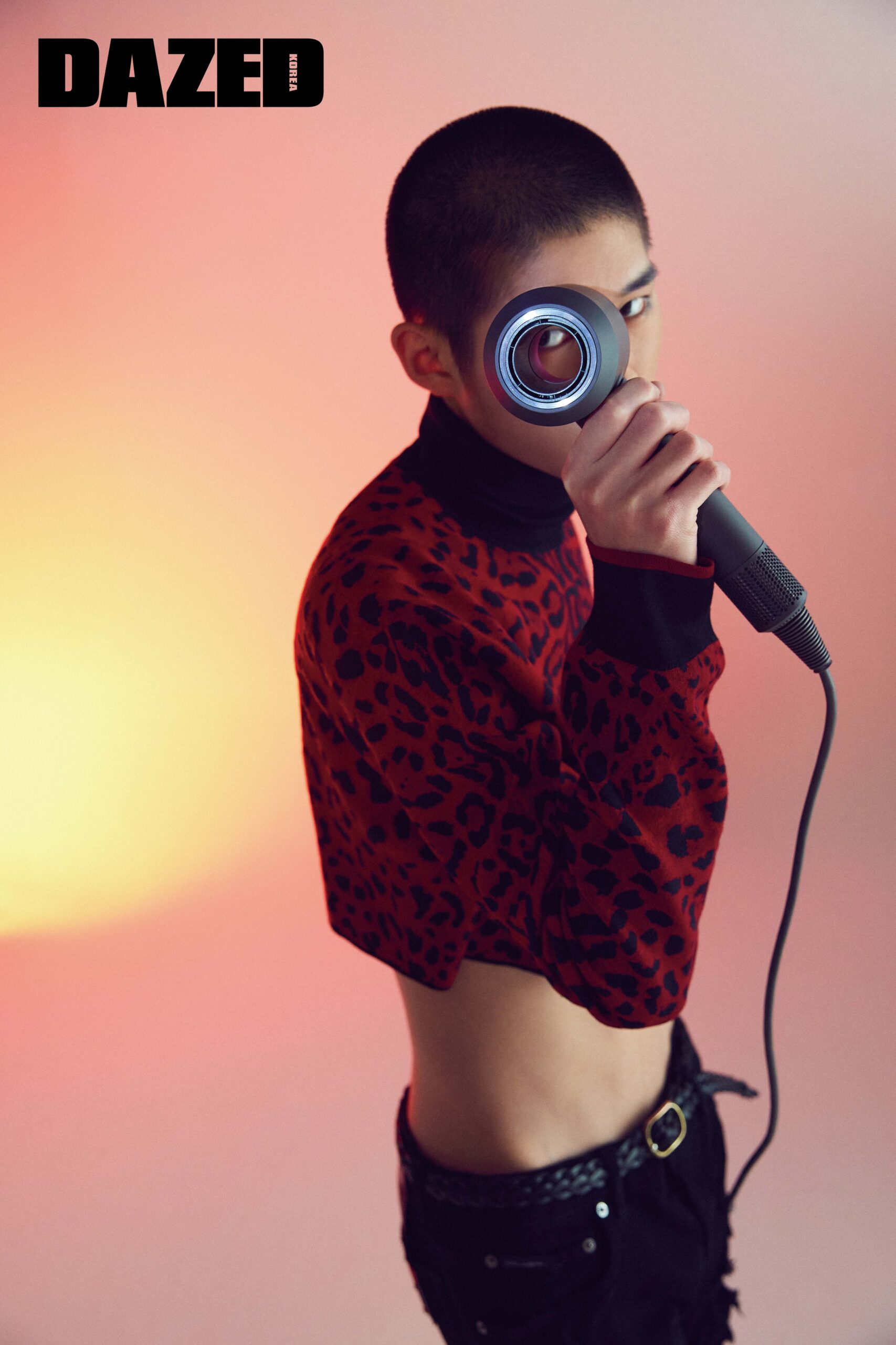애니멀 패턴의 쇼트 터틀넥 톱과 블랙 데님 팬츠는 돌체앤가바나(Dolce&Gabbana), 레더 벨트는 에디터의 것.