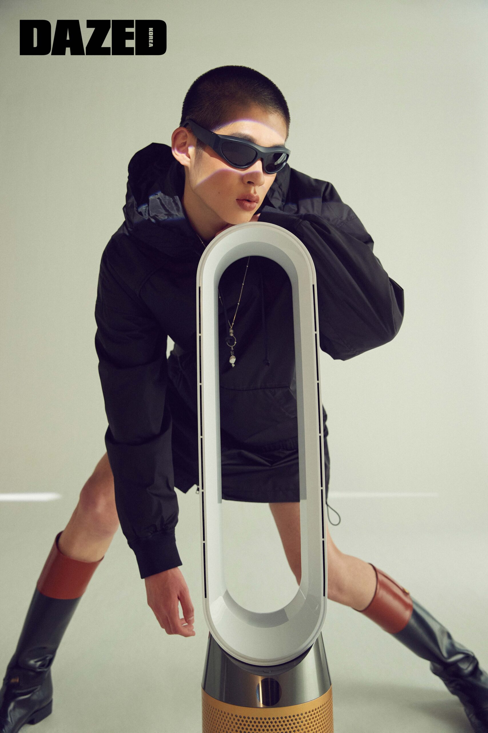 롱 레이어링 패딩 후디는 준지(Juun.J), 니하이 부츠는 구찌(Gucci), 블랙 프레임 선글라스는 에이치앤엠(H&M), 네크리스는 다즐링 클럽(Dazzling Club).