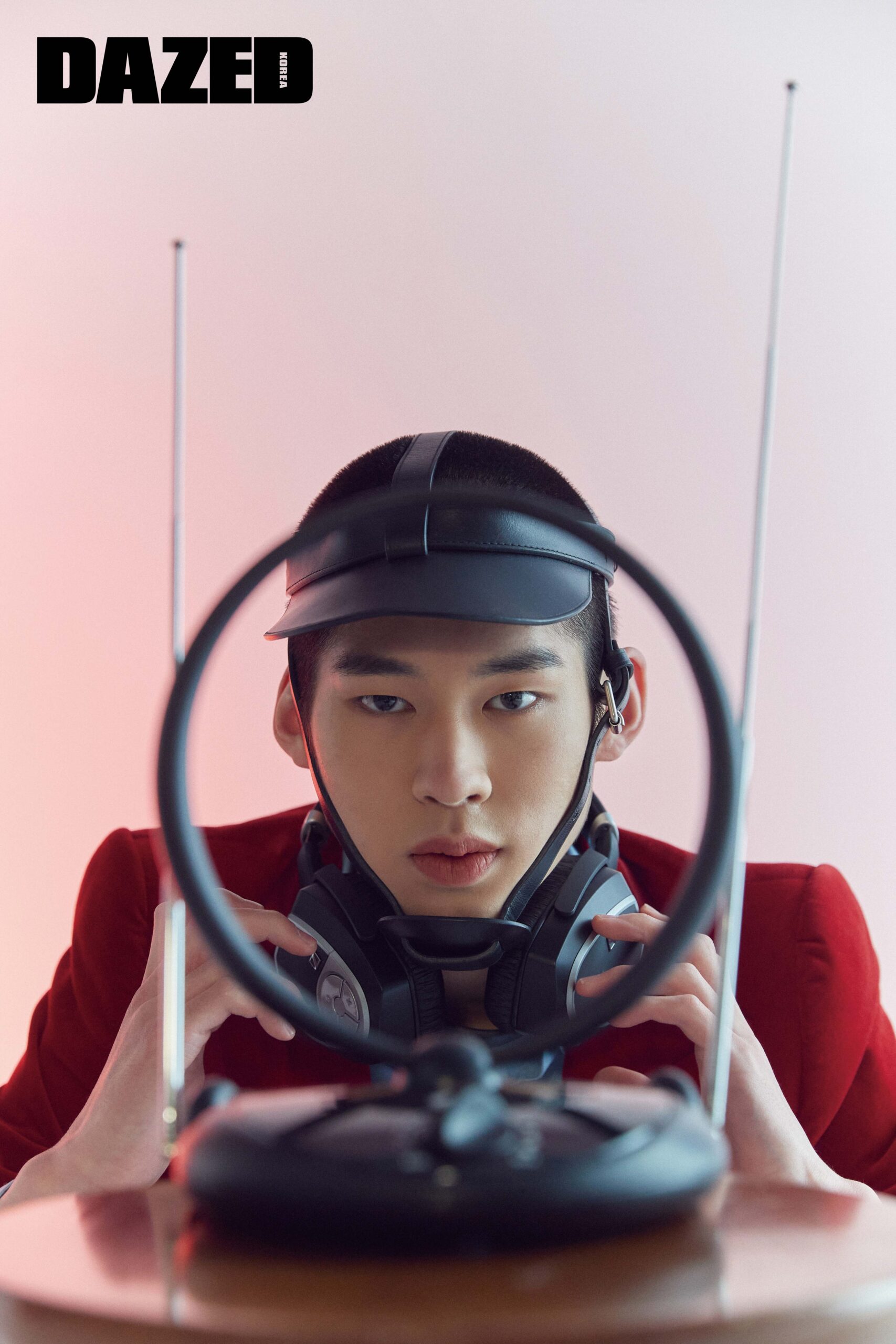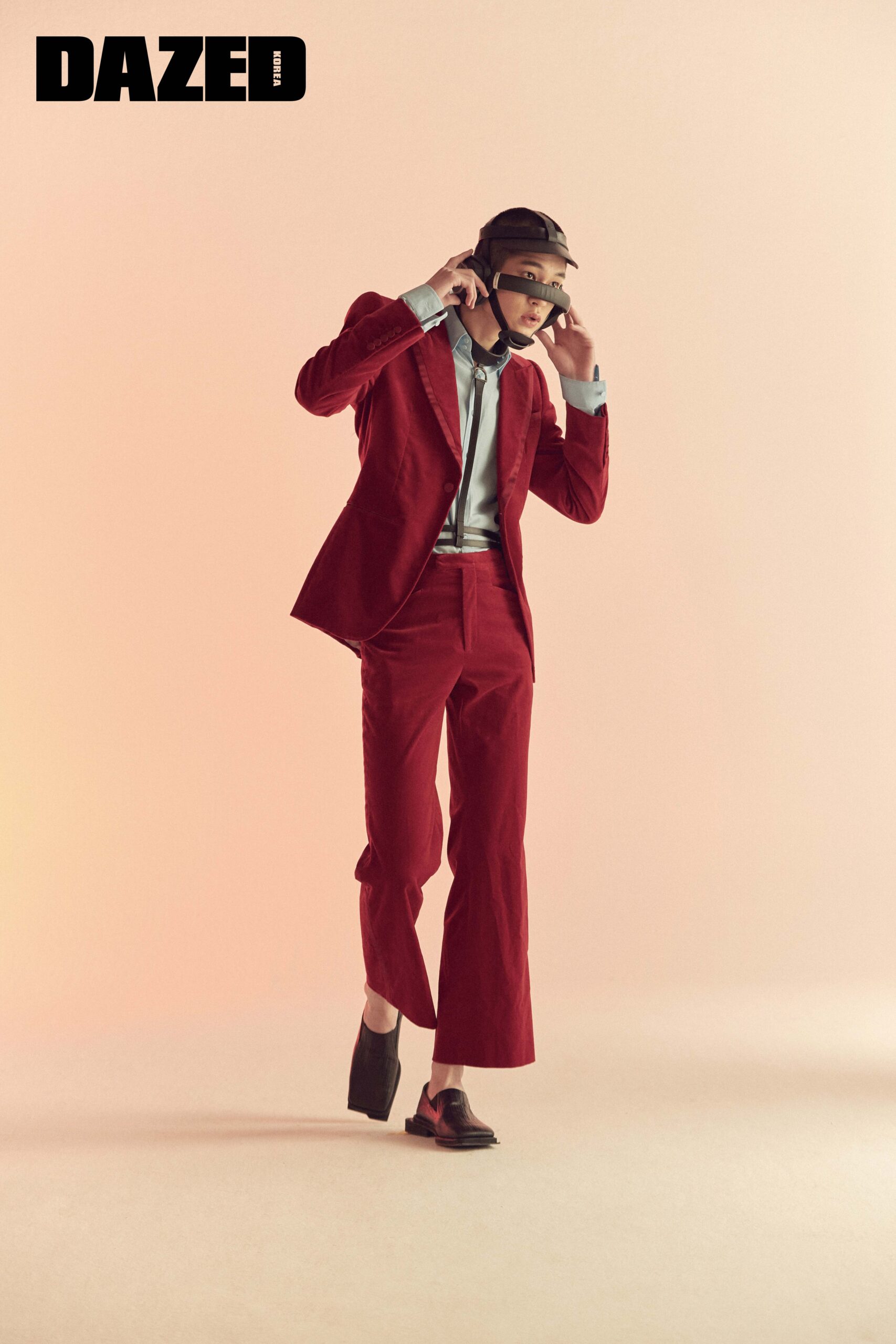 새틴 디테일의 레드 스트레치 벨벳 재킷과 팬츠, 실크 크레이프 라이트 블루 셔츠, 하네스 스타일의 초커와 벨트, 레더 헤드피스는 모두 구찌(Gucci), 언밸런스 포인트의 스퀘어 토 로퍼는 네거티브쓰리(Negative Three).