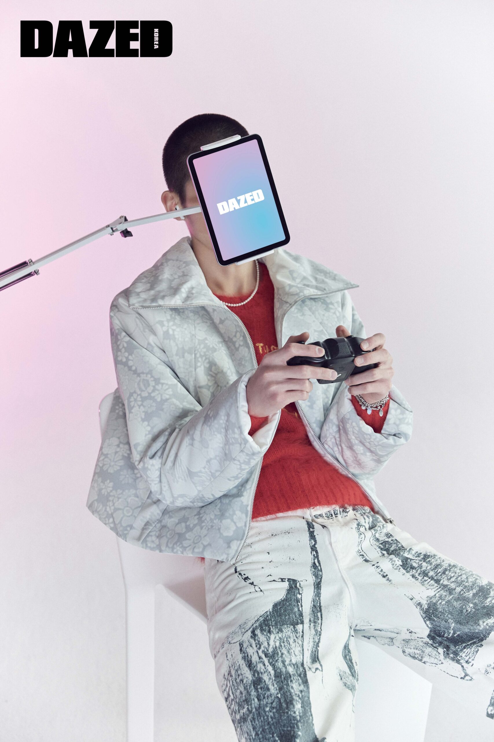 플라워 패턴의 패딩 점퍼는 윤세(Yunse), 자수 디테일 레드 컬러 니트 톱은 더 뮤지엄 비지터(The Museum Visitor), 프린트 팬츠는 오프화이트(Off-White™), 펄 네크리스는 엔프프(Nff), 브레이슬릿은 다즐링 클럽(Dazzling Club).