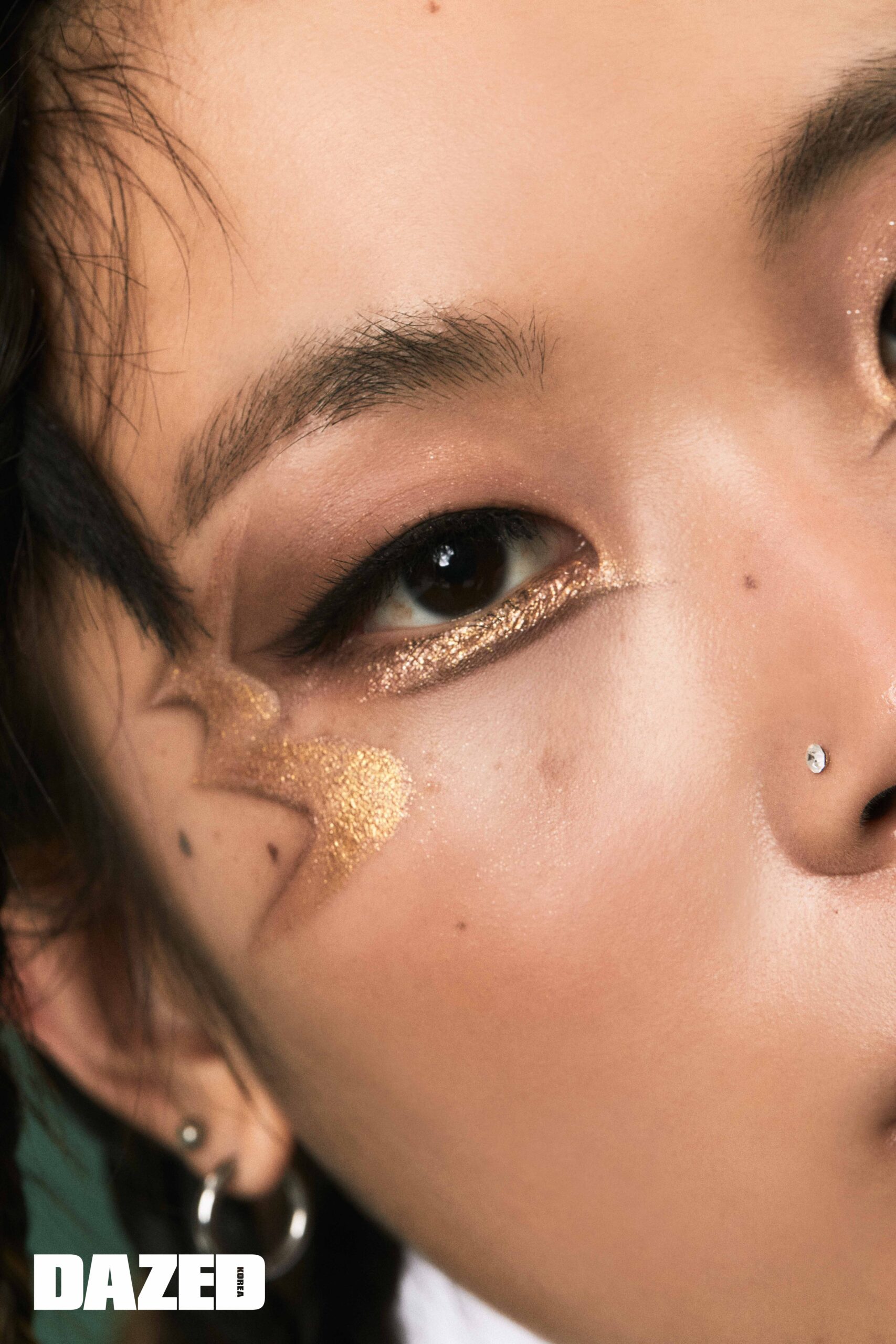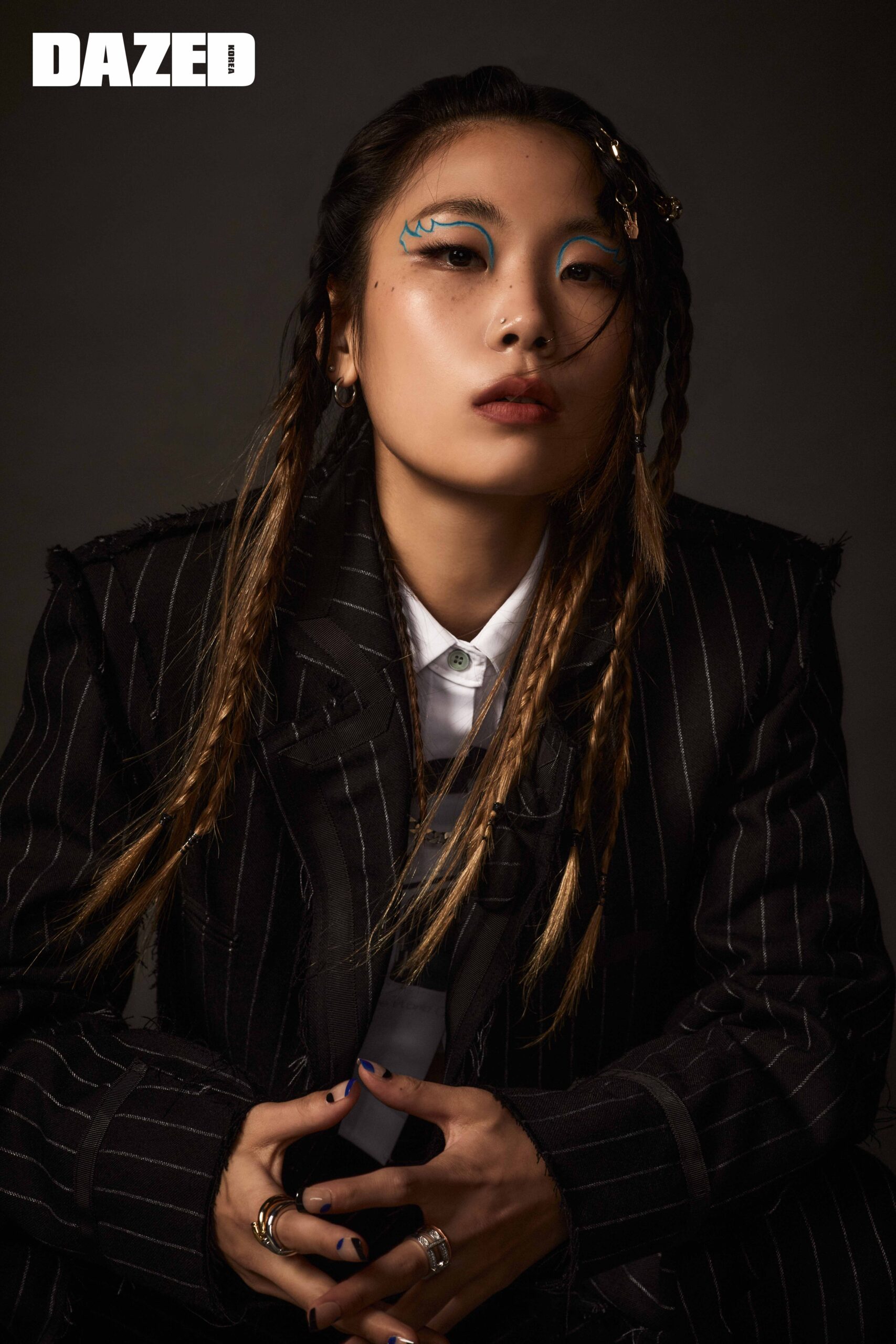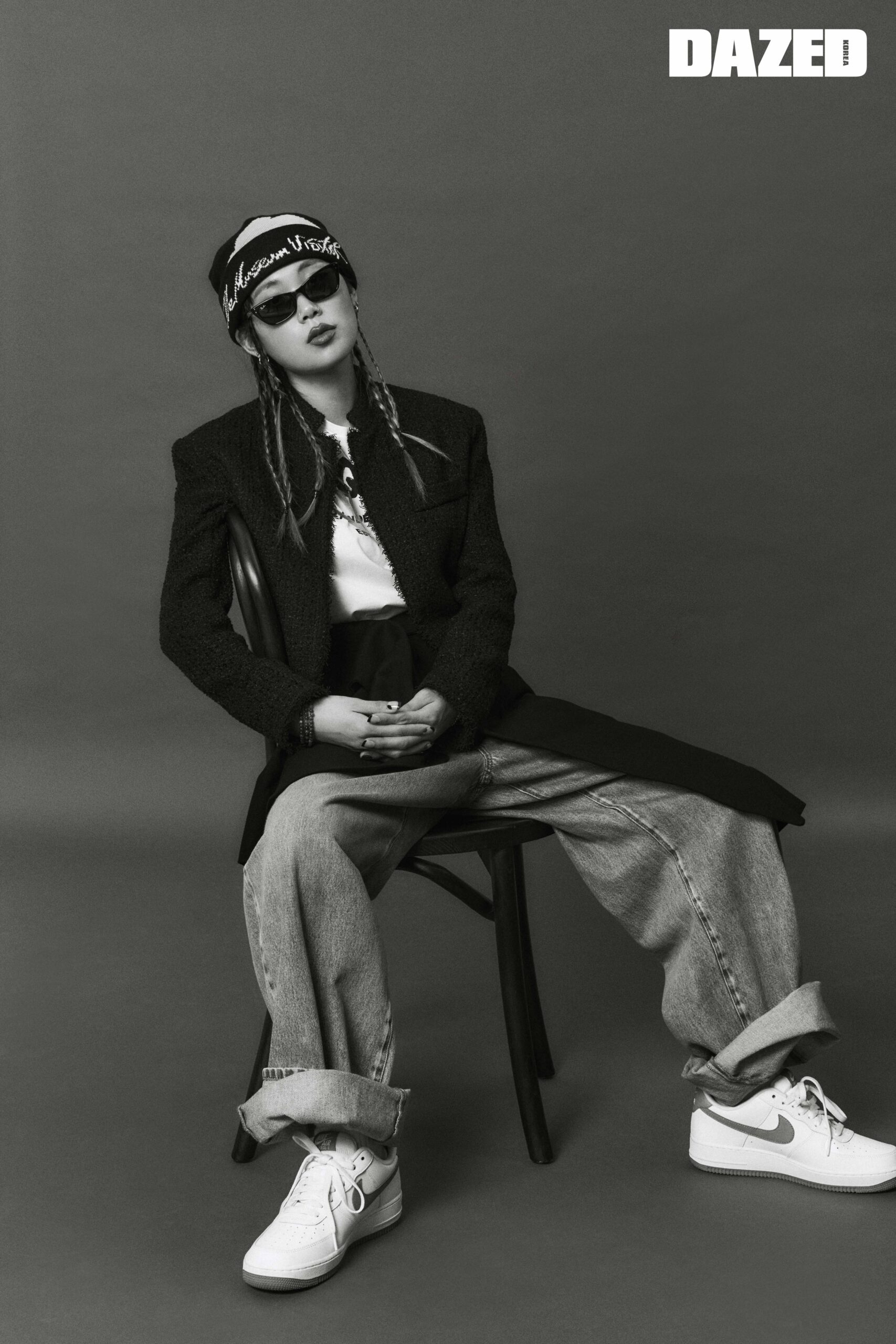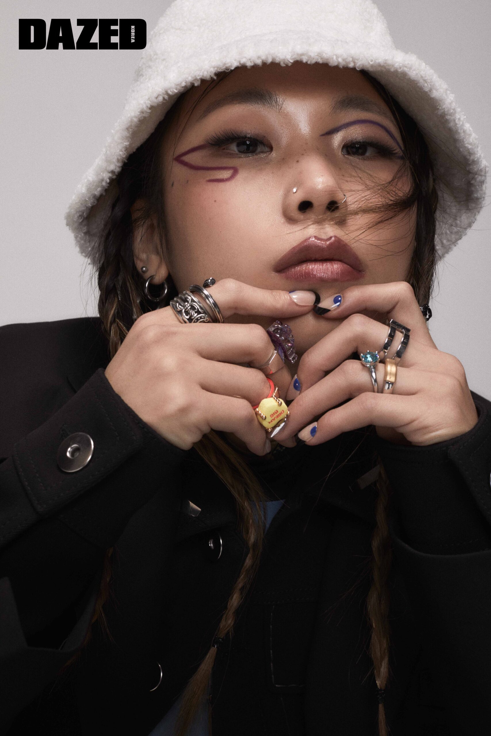 오버사이즈 재킷은 수기(Su Gi), 이너로 레이어링한 트라이앵글 메탈 플레이트 디테일 울 재킷은 보테가 베네타(Bottega Veneta), 와이드 팬츠는 COS, CK 로고 쉐르파 버킷 해트는 캘빈클라인 진 액세서리(Calvin Klein Jeans Accessories), 볼드 각인 링은 크롬하츠(Chrome Hearts), 트위스트 커브드 텍스처 링은 퍼스널서비스(Personal/Service), 젤리 베어 링과 하트 캔디 모티브 링, 크리스털 스카이 블루 링은 모두 믹시마이(Mikshimai), 더블 메탈 링은 일레란느(Ille Lan), 골드 플레이트 실버 링은 트렌카디즘(Trencadism), 빅 로고 퍼프드 슈즈는 오니츠카 타이거(Onitsuka Tiger).