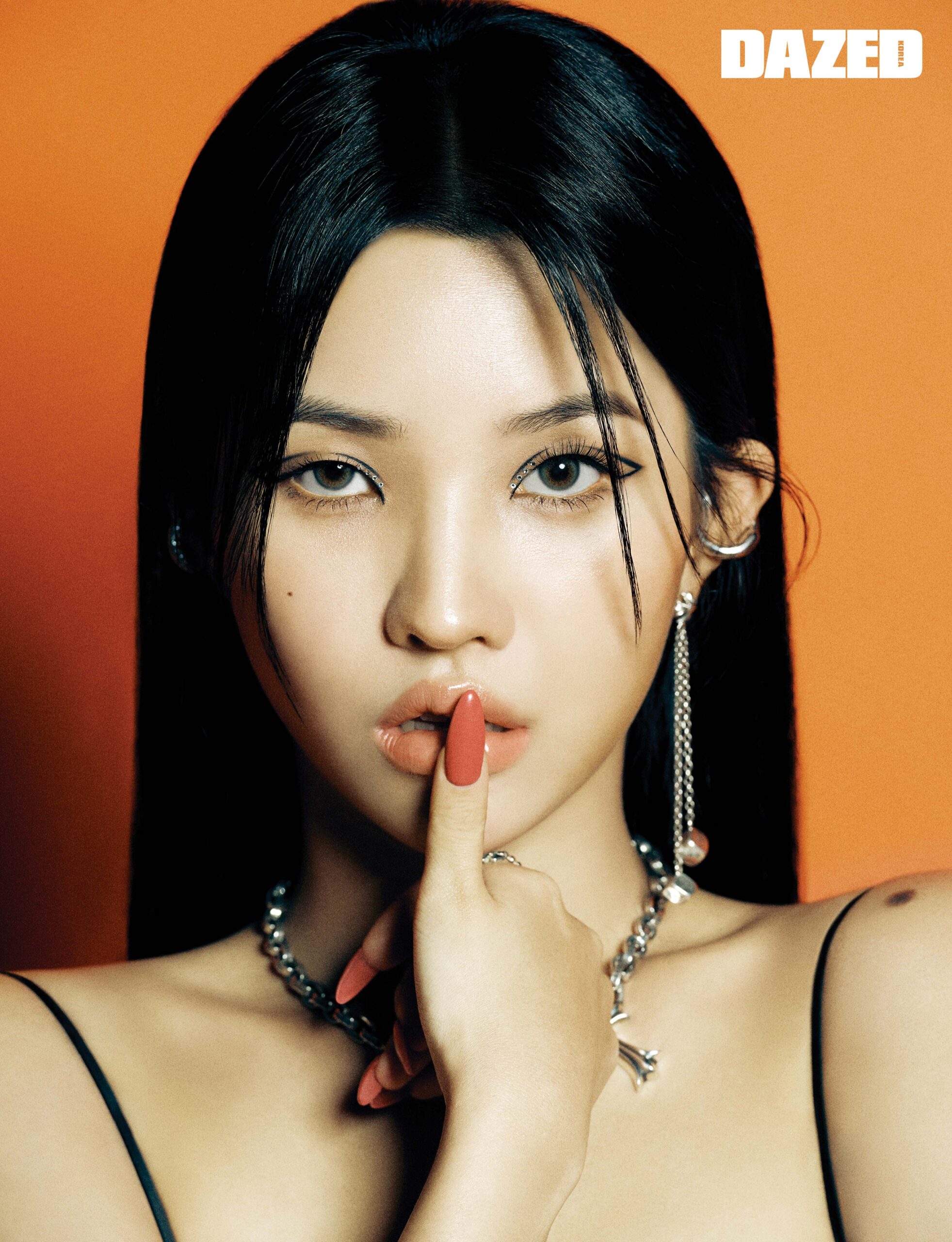 브라톱 드레스는 와이씨에이치(YCH), 볼드한 체인 네크리스와 드롭 이어링, 검지에 낀 볼 체인 링은 모두 크롬하츠(Crome Hearts), 이어 커프는 셀뮤트(Cellmute), 그 외 레이어링한 링은 모두 락킹에이지(Rocking Ag), 펄 피어싱은 소연의 것.