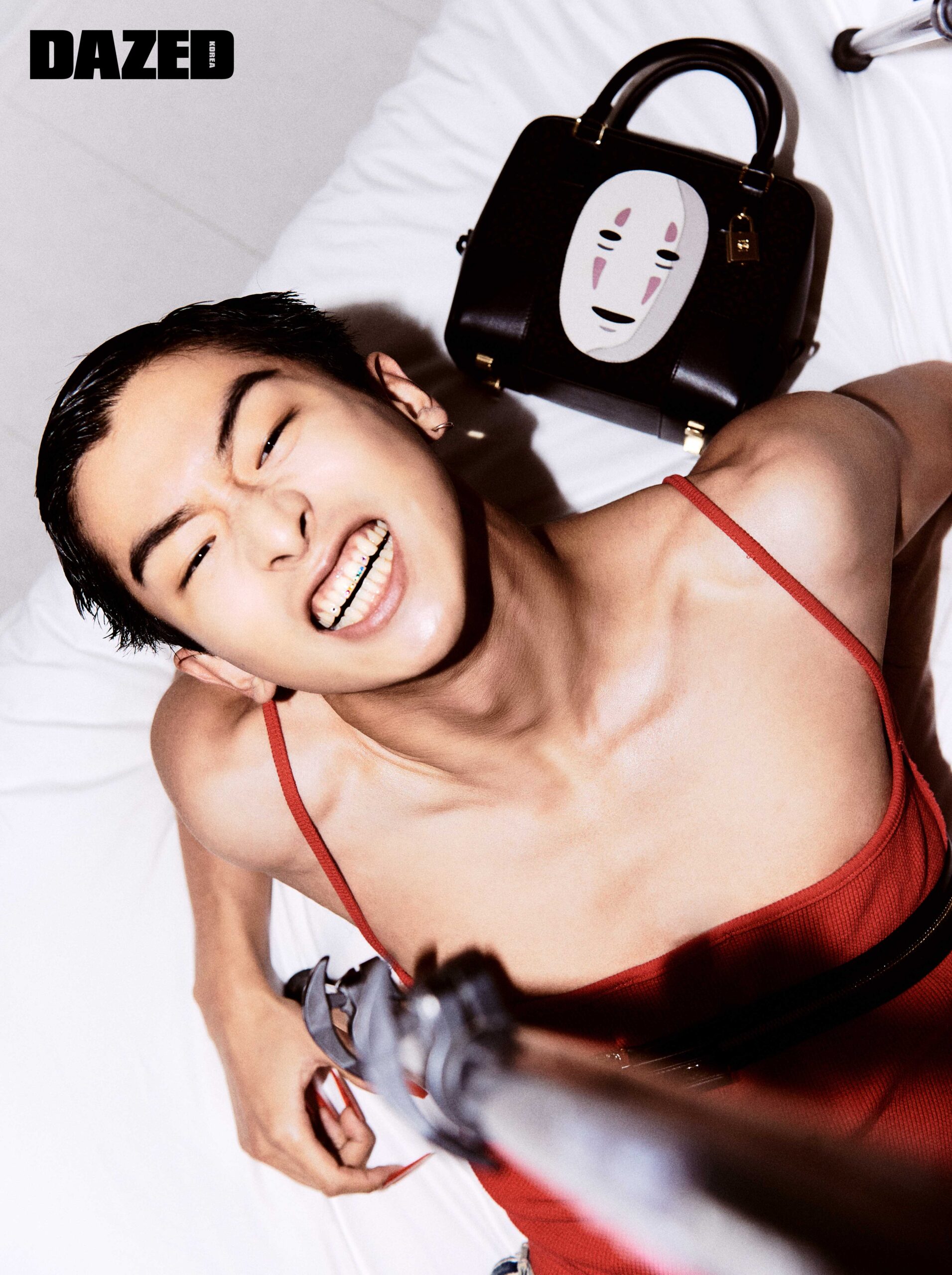가슴에 착용한 벨트는 샤넬(Chanel), 블랙 스몰 토트백은 로에베 X 센과 치히로의 행방불명(Loewe X Spirited Away), 레드 슬리브리스 톱과 데님 팬츠는 에디터의 것, 이어링은 유고의 것.