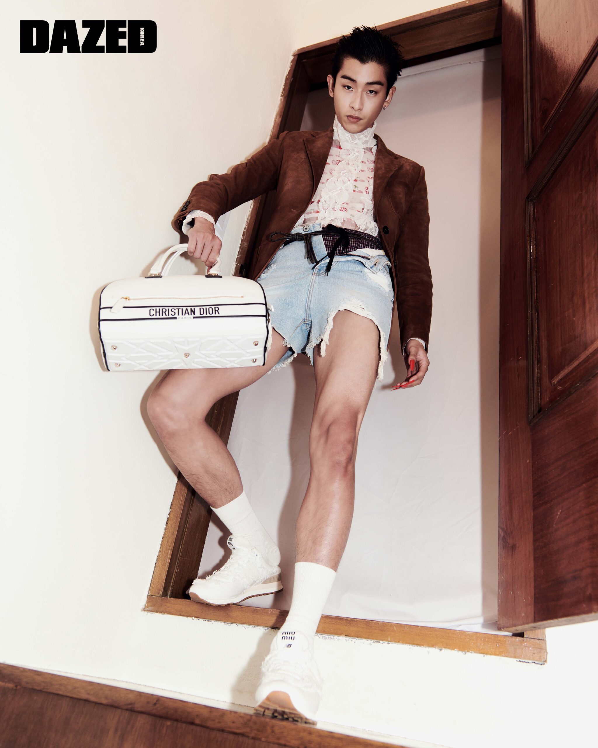 브라운 스웨이드 재킷은 미우 미우(Miu Miu), 프릴 디테일 시스루 셔츠는 발렌티노(Valentino), 흰색 스니커즈는 뉴발란스 X 미우 미우(New Balance X Miu Miu), 로고가 돋보이는 지퍼 볼링 백은 디올(Dior), 이너로 착용한 톱과 데님 쇼츠, 블랙 언더웨어, 화이트 삭스는 모두 에디터의 것, 이어링은 유고의 것.