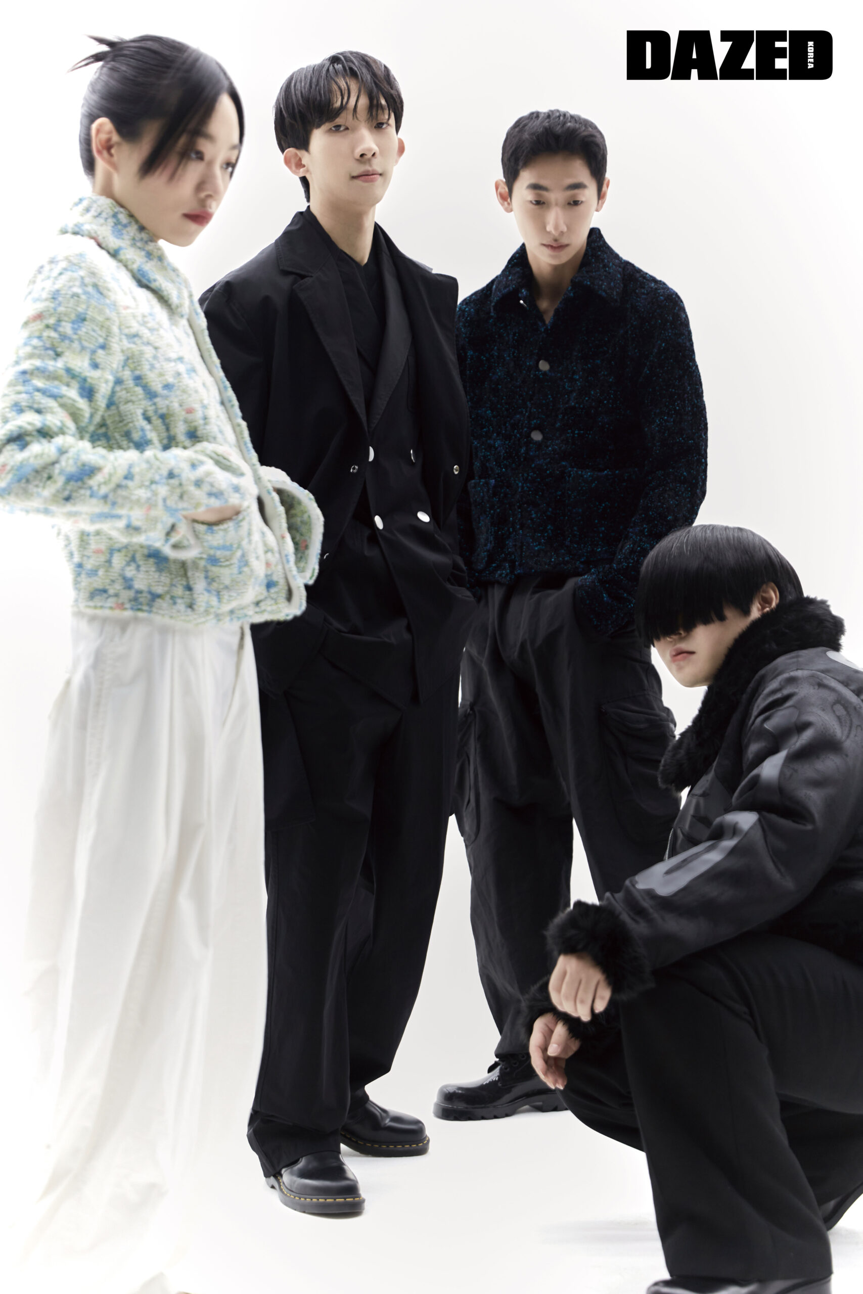 다영이 입은 퍼 재킷과 화이트 팬츠, 옐로 힐은 모두 보테가 베네타(Bottega Veneta). 건석이 입은 블랙 코트와 재킷, 셔츠, 팬츠는 모두 보테가 베네타(Bottega Veneta), 첼시 부츠는 닥터마틴(Dr. Martens). 하람이 입은 퍼 재킷과 러버 슈즈는 보테가 베네타(Bottega Veneta), 카고 팬츠는 겐조(Kenzo). 성훈이 입은 퍼 디테일 레더 재킷은 써저리 by 샘플라스(Surgery by Samplas), 팬츠는 렉토(Recto), 더비 슈즈는 프라다(Prada).