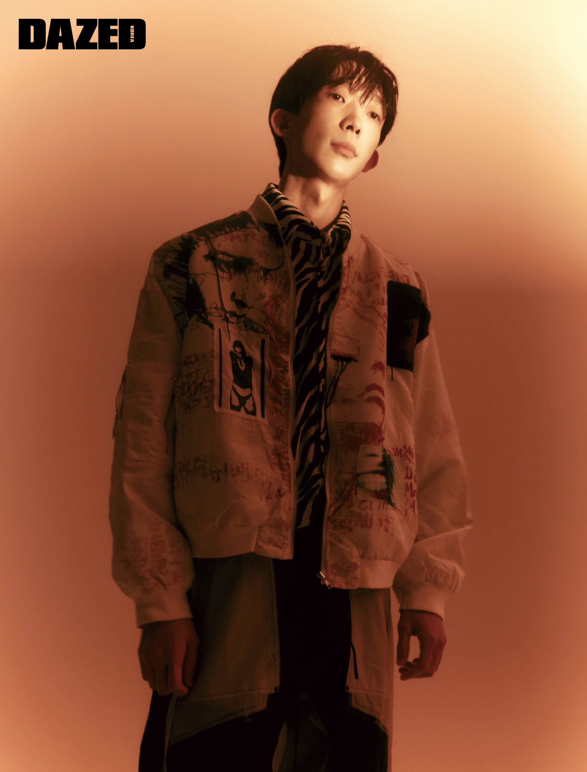 프린트 보머 재킷은 선데이 오프 클럽 by 샘플라스(Sunday Off Club by Samplas), 지브라 패턴 셔츠는 더그레이티스트(The Greatest), 멀티패턴 나일론 팬츠는 카르넷 아카이브 by 샘플라스(Carnet Archive by Samplas).