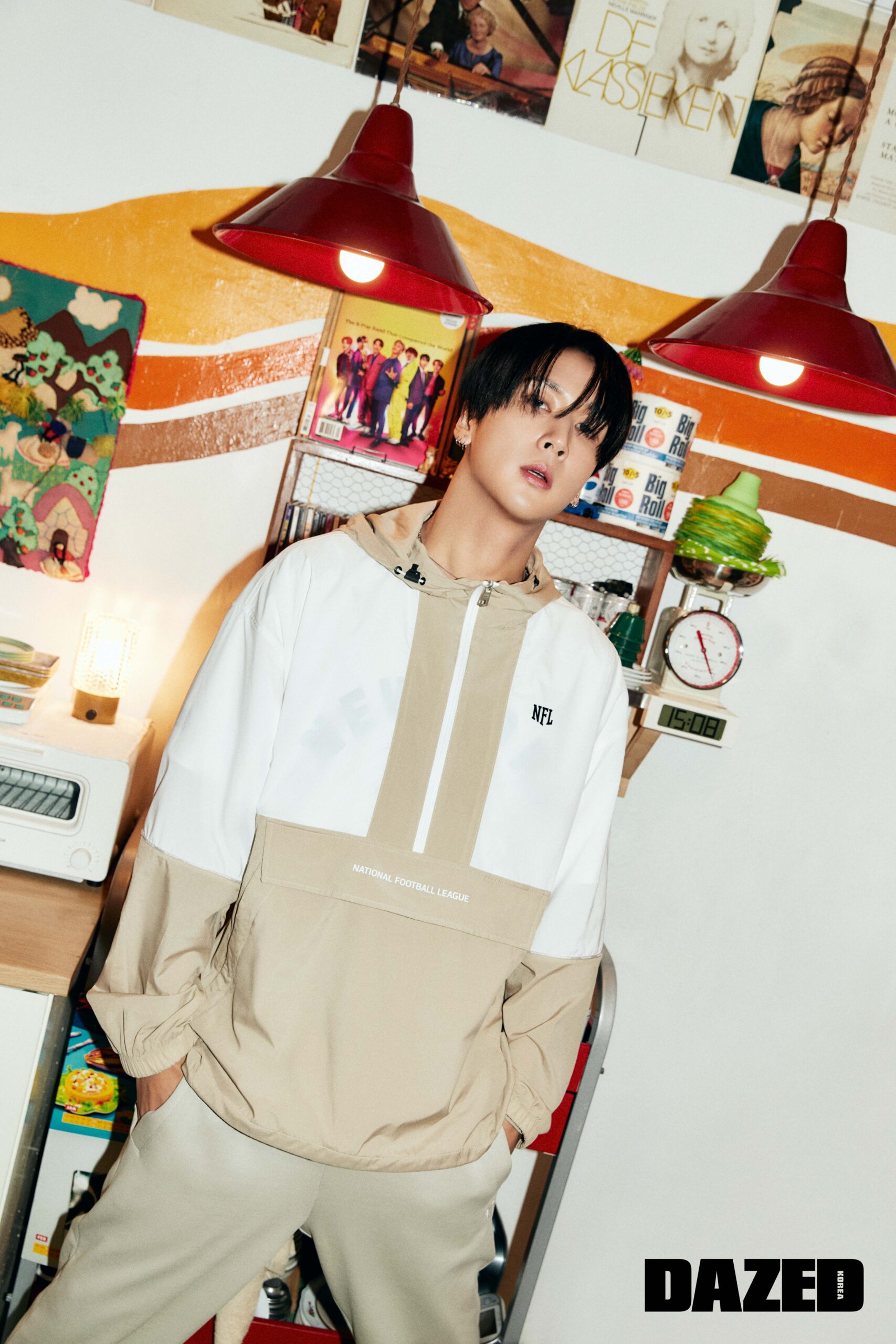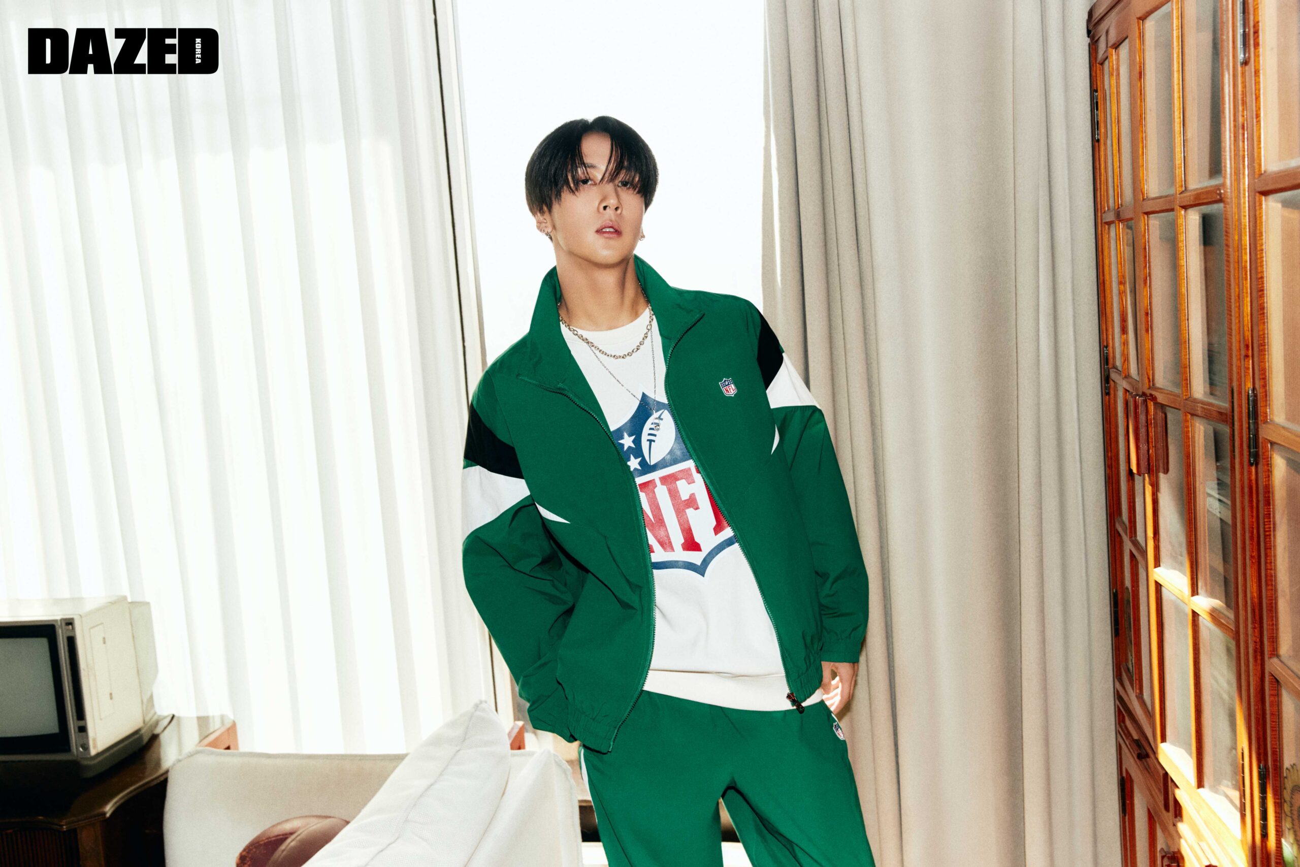 레트로 무드의 절개 배색 디테일 하이넥 엔드존 재킷과 아이보리 컬러의 빅 로고 스웨트셔츠, 절개 배색 디테일 엔드존 조거 팬츠는 모두 엔에프엘(NFL), 골드 체인 네크리스와 펜던트 네크리스는 불레또(Bulletto).
