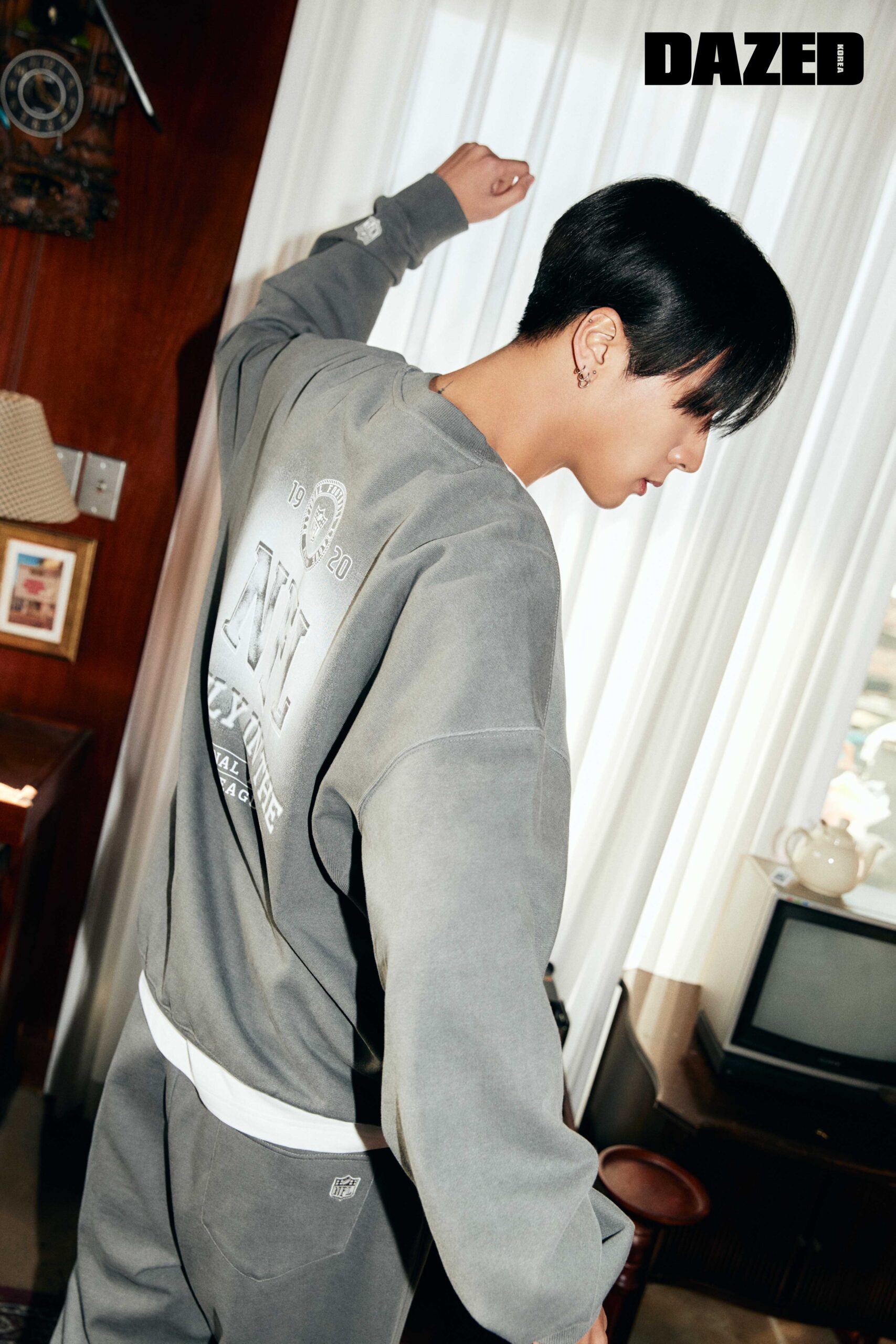 피그먼트 다잉이 특징인 섀도 맨투맨과 이너로 입은 화이트 하프 슬리브 티셔츠, 섀도 조거 팬츠는 모두 엔에프엘(NFL).
