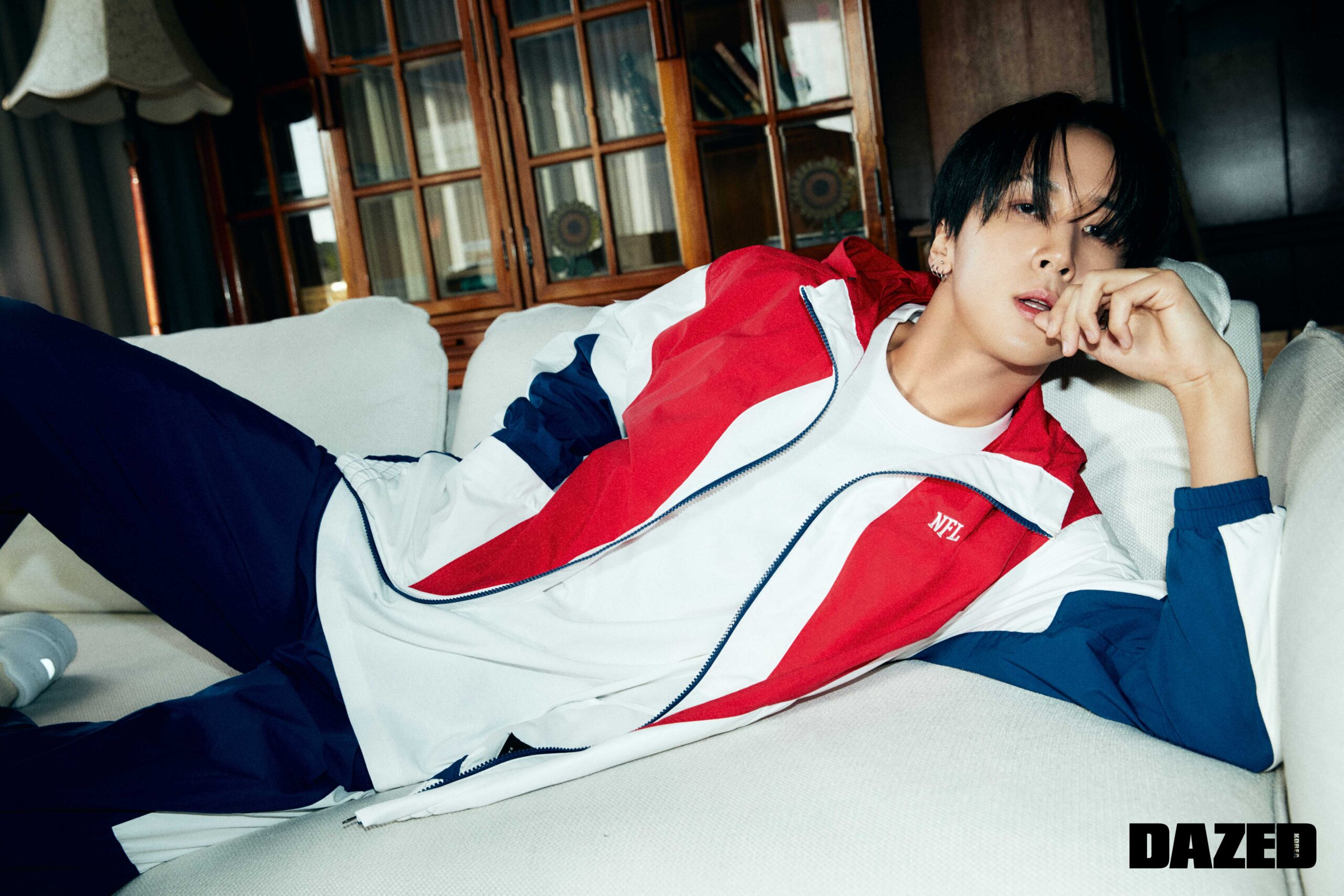 NFL 빅 로고 아트워크를 적용한 프라이머리 후드 톱과 이너로 입은 레드 컬러의 하프 슬리브 티셔츠, NFL 스몰 로고 아트워크를 적용한 에센셜 스웨트쇼츠는 모두 엔에프엘(NFL), 골드 펜던트 네크리스는 포트레이트 리포트(Portrait Report), 실버 링은 불레또(Bulletto), 삭스와 블랙 스니커즈는 에디터의 것.