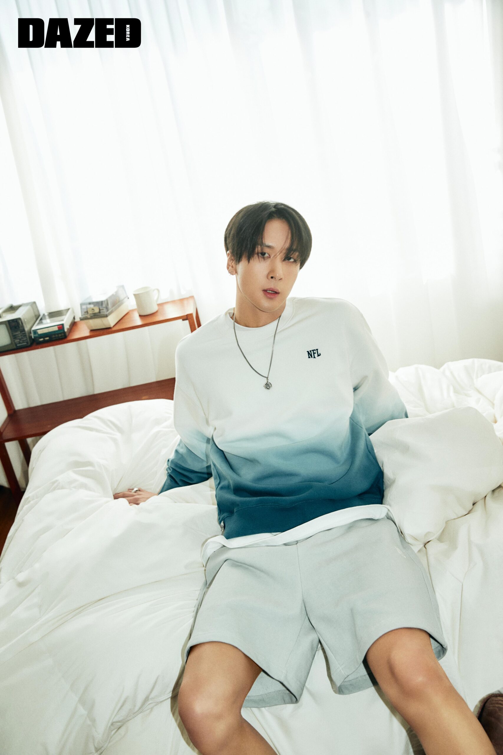 자연스러운 그러데이션이 특징인 퍼스트 다운 스웨트셔츠와 이너로 입은 화이트 하프 슬리브 티셔츠, 섀도우 스웨트쇼츠는 모두 엔에프엘(NFL), 실버 펜던트 네크리스와 실버 링은 불레또(Bulletto).