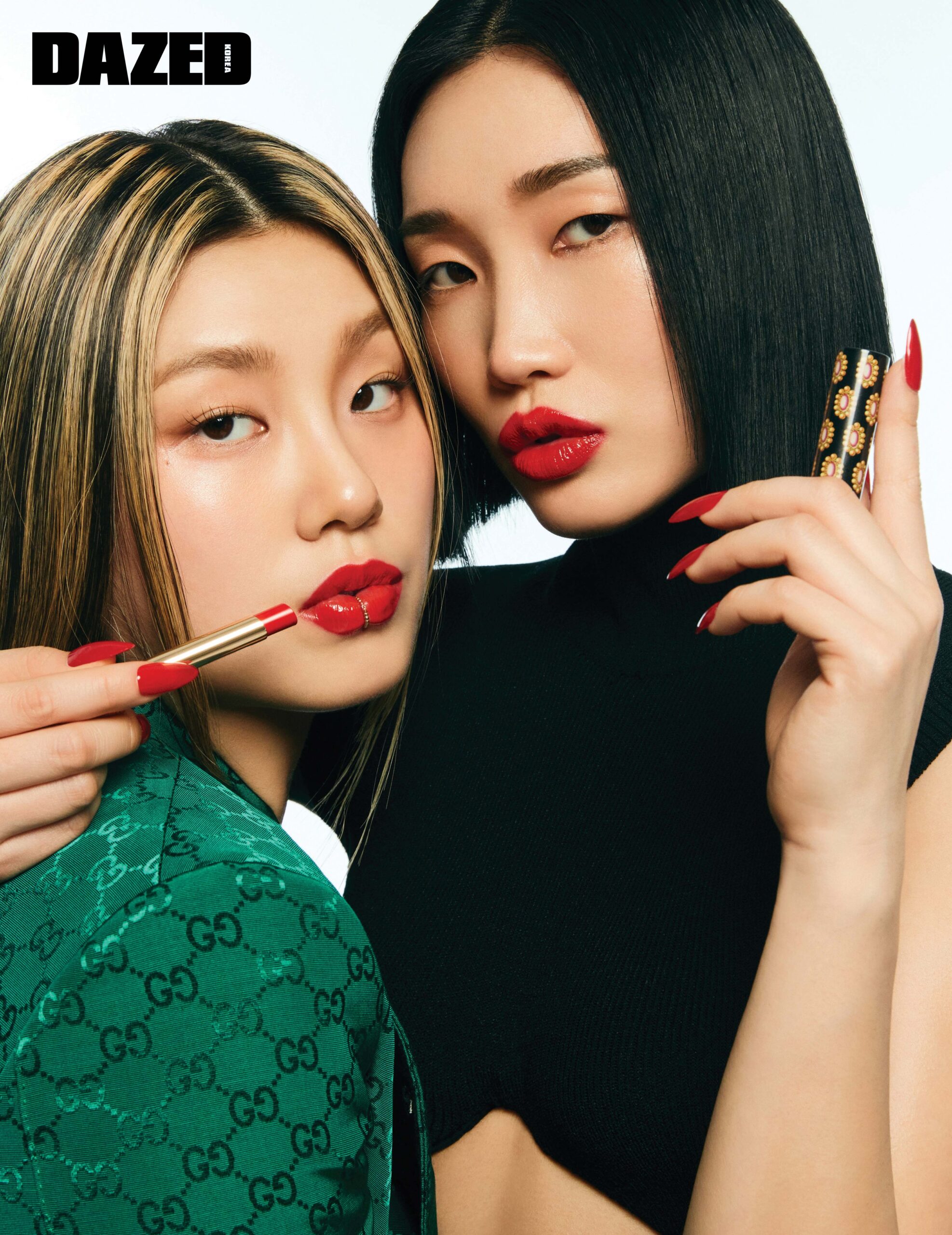 리정이 입은 에메랄드 그린 라이트 GG 캔버스 더블브레스트 재킷은 구찌(Gucci). 립제이가 입은 터틀넥 크롭트 니트 톱은 구찌(Gucci).