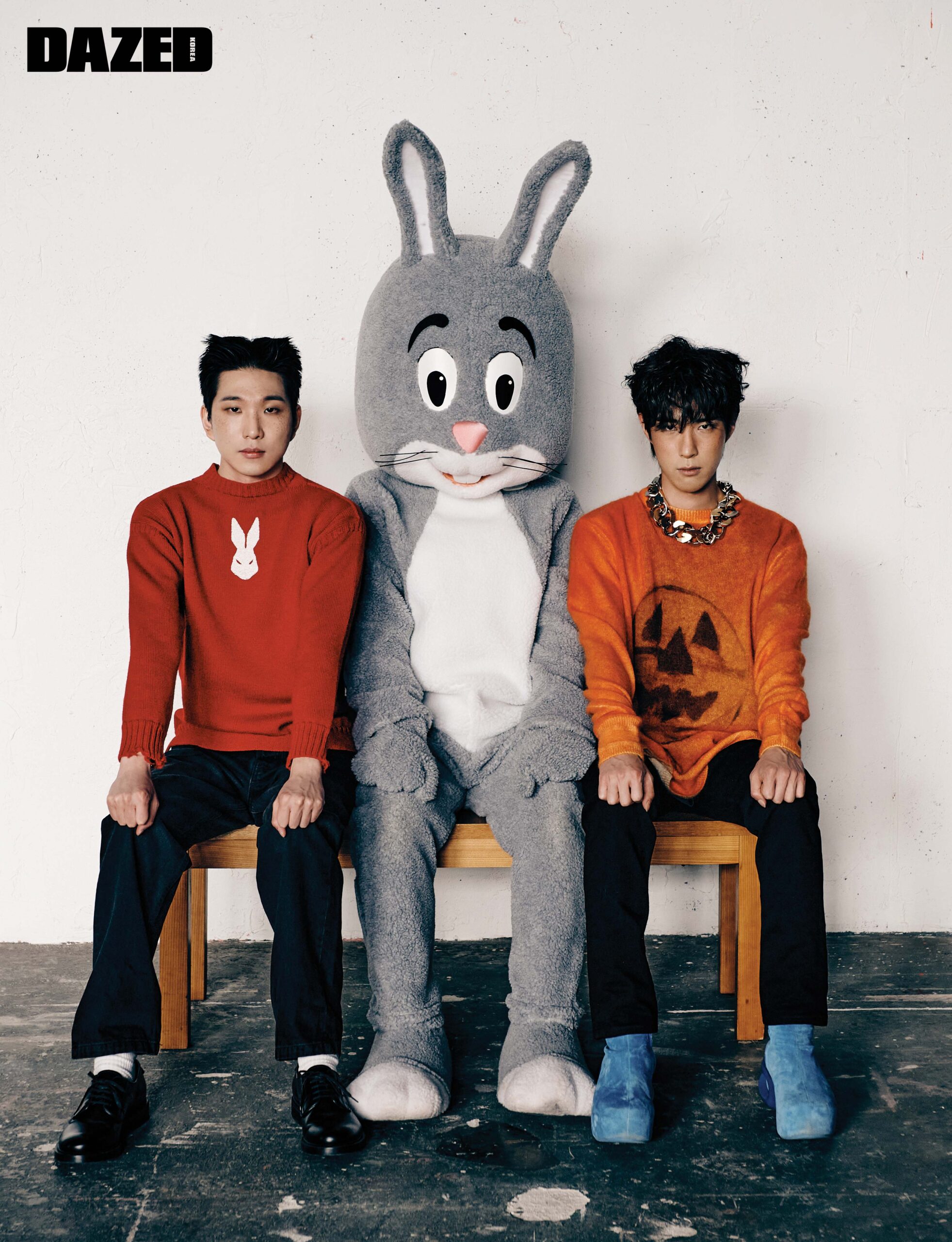 혁준이 입은 토끼 모양이 포인트의 스웨터는 메종 마르지엘라(Maison Margiela), 로 라이즈 데님 팬츠는 레이 at 매치스패션(Raey at Matchesfashion), 블랙 레이스업 슈즈는 프라다(Prada), 삭스는 에디터의 것. 준원이 입은 펌킨 고스트 포인트의 스웨터와 오버사이즈 타이다이 티셔츠, 블랙 스키니 진, 블루 러버 힐 부츠, 볼드한 체인 네크리스는 모두 지방시(Givenchy).