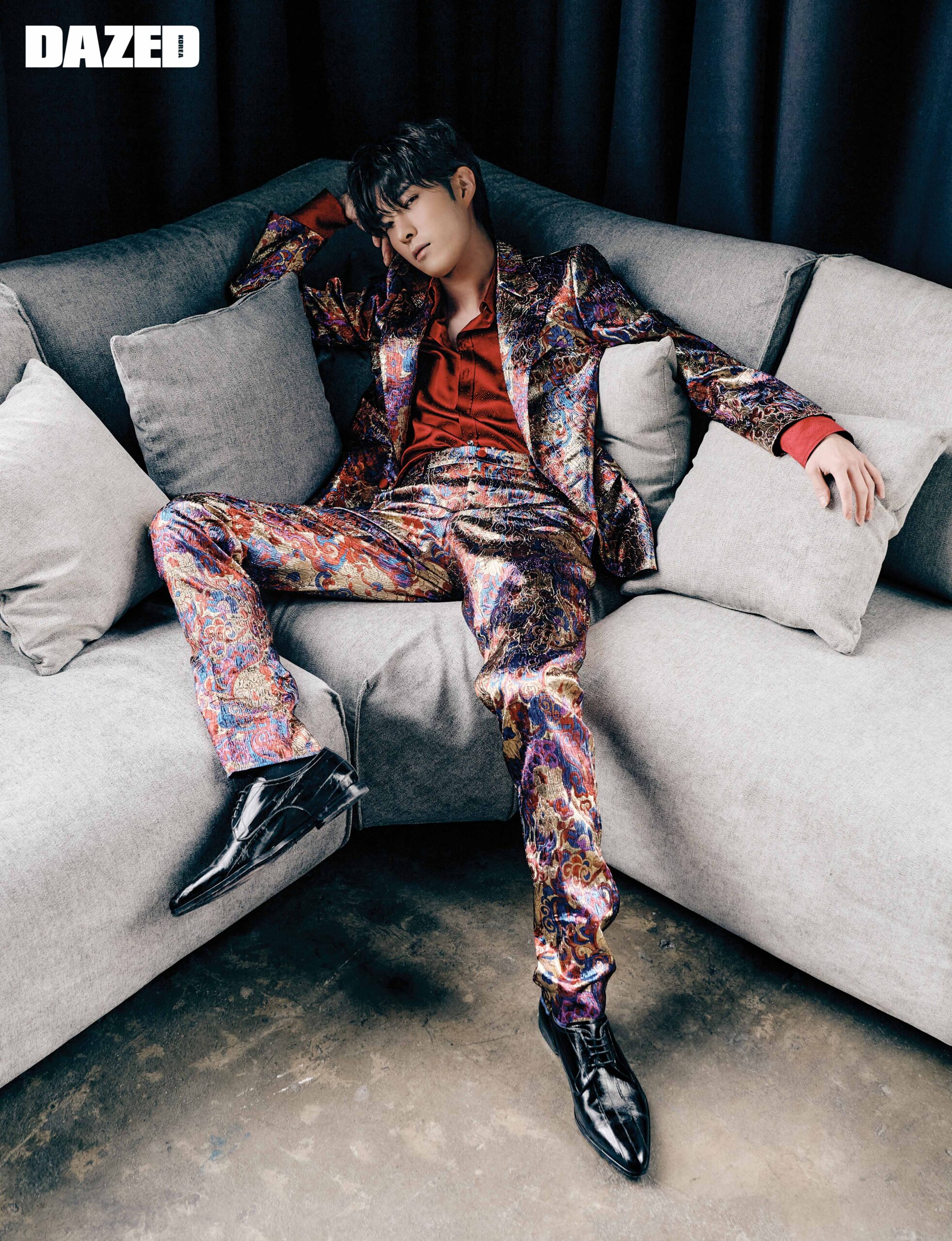 준원이 입은 자카르 소재의 포토그래픽 재킷과 팬츠, 실크 자카르 소재의 레드 컬러 셔츠, 블랙 더비 슈즈는 모두 돌체앤가바나(Dolce&Gabbana), 삭스는 에디터의 것.