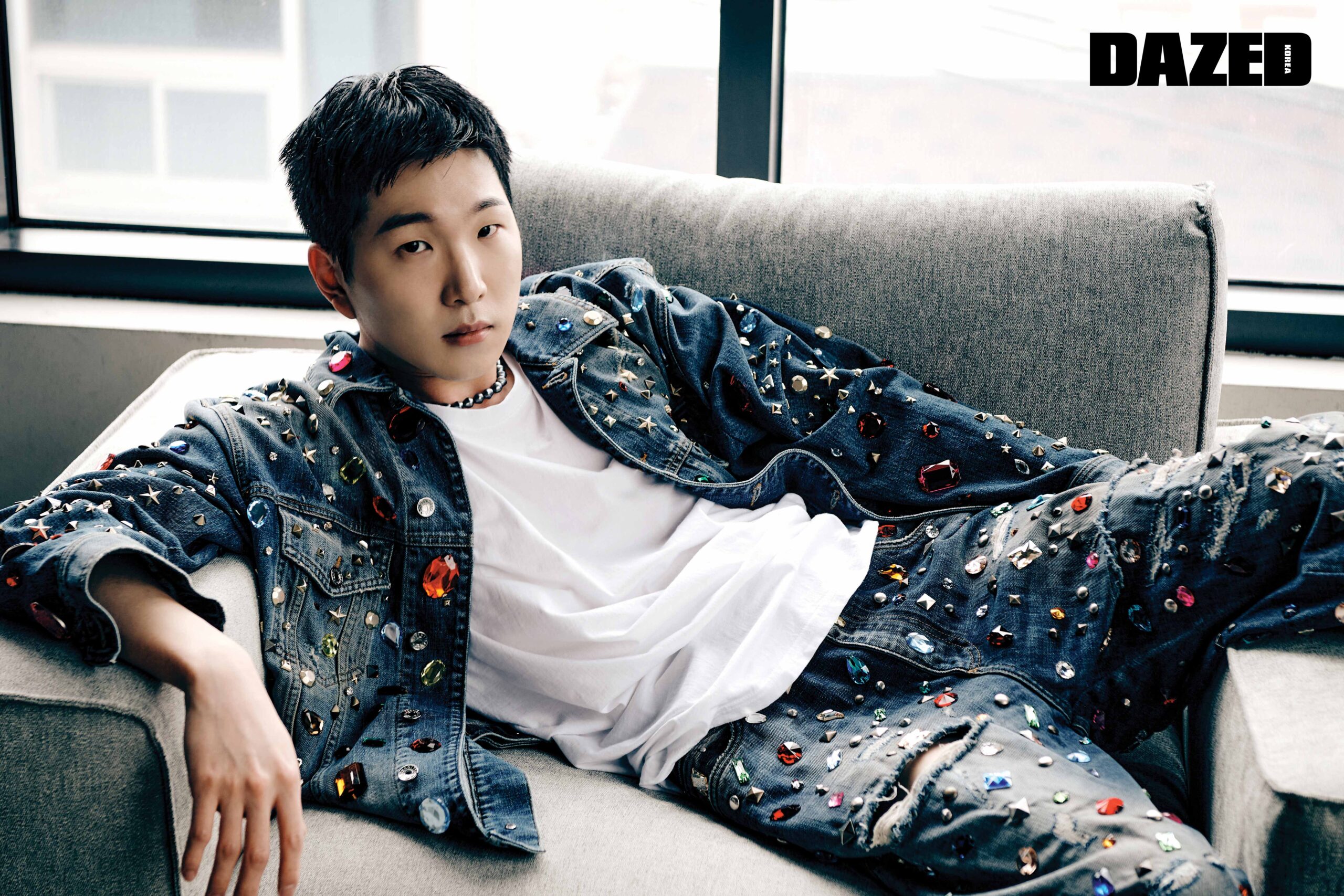 크리스털, 스터드 장식의 오버사이즈 데님 재킷과 데님 팬츠, 볼드한 디테일이 돋보이는 슈즈, 펄 장식 네크리스는 모두 돌체앤가바나(Dolce&Gabbana), 티셔츠와 삭스는 에디터의 것.