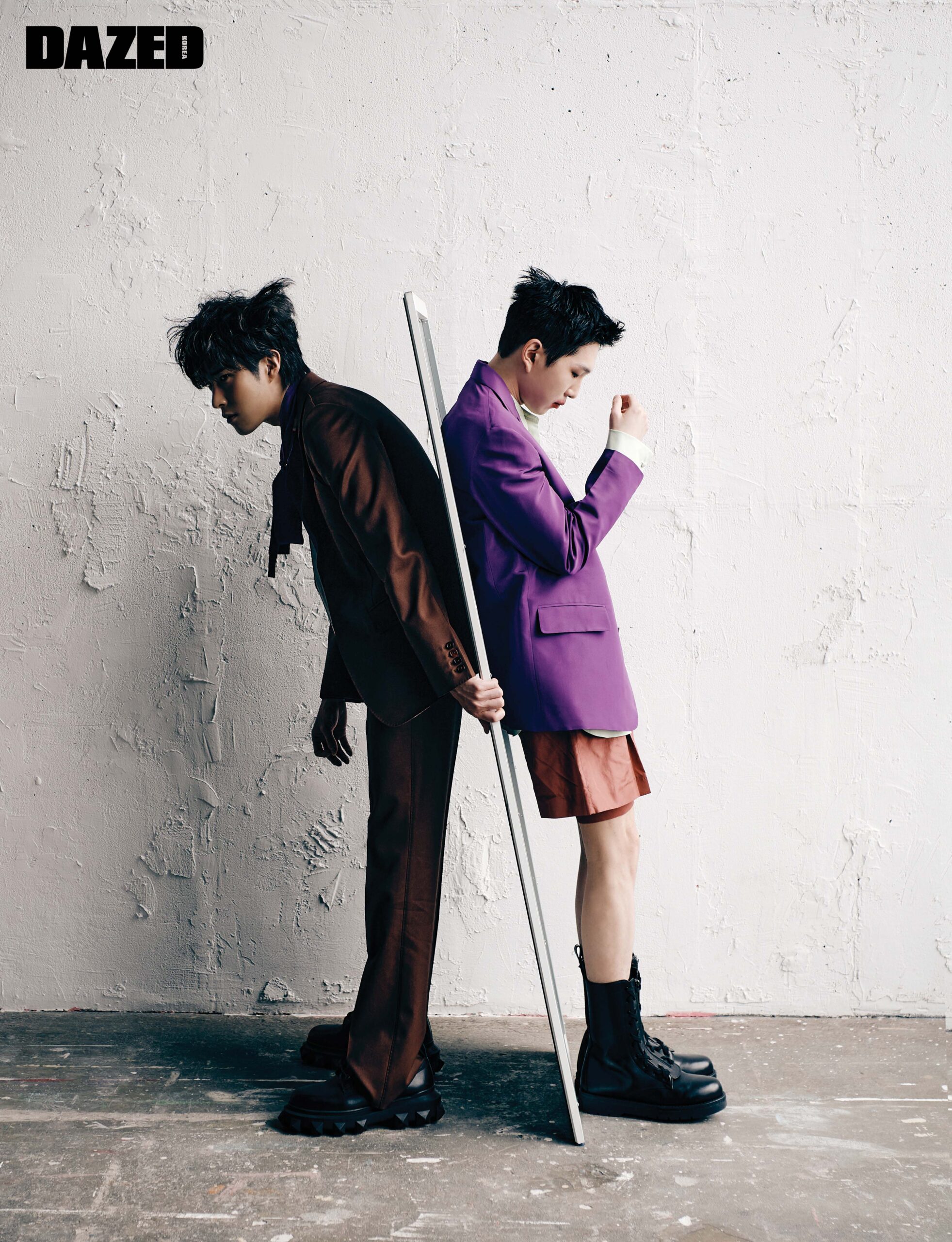 준원이 입은 울 소재의 브라운 컬러 재킷과 팬츠, 스카프 칼라 퍼플 컬러 실크 셔츠는 모두 발렌티노(Valentino), 스터드 더비 슈즈는 발렌티노 가라바니(Valentino Garavani).혁준이 입은 실크 소재의 퍼플 컬러 재킷과 스탠드칼라 디테일 코튼 셔츠, 실크 소재 쇼츠, 니트 쇼츠는 모두 발렌티노(Valentino), 블랙 컴뱃 부츠는 발렌티노 가라바니(Valentino Garavani).