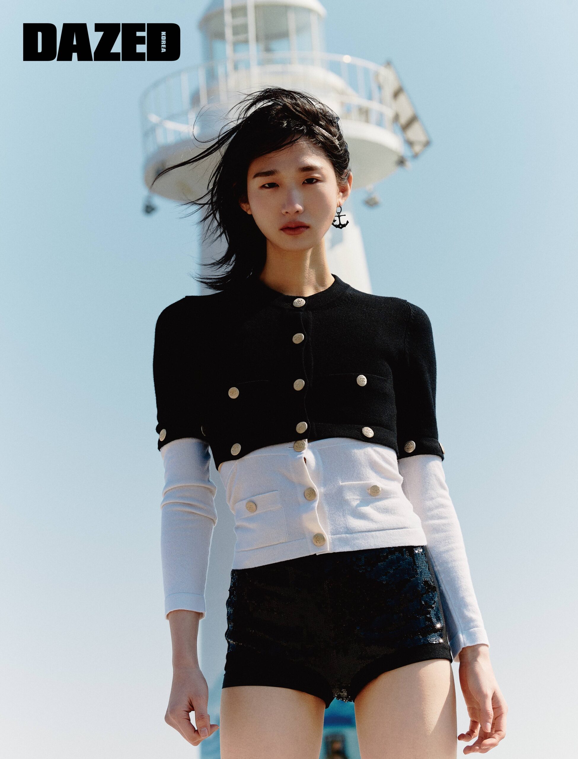 버튼 디테일 니트 톱과 스팽글 쇼츠, 로고 헤어밴드는 모두 샤넬(Chanel), 앵커 모양의 블랙 이어링은 프라다(Prada).
