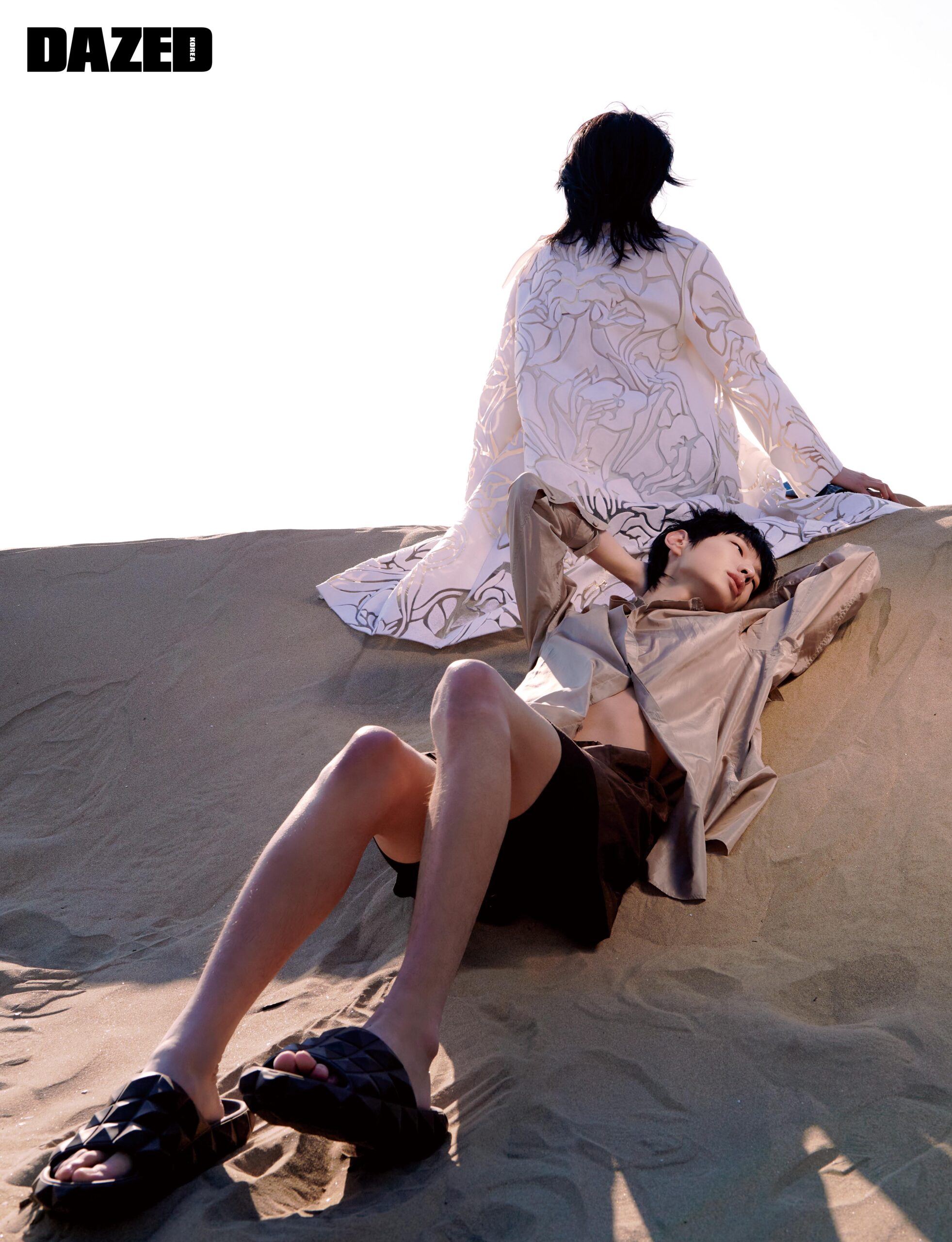 김온이 입은 플라워 패턴의 화이트 코트와 이너로 입은 시스루 셔츠는 모두 발렌티노(Valentino). 정우가 입은 스카프 디테일의 셔츠와 나일론 소재의 쇼츠, 스터드 장식 슬리퍼는 모두 발렌티노(Valentino).