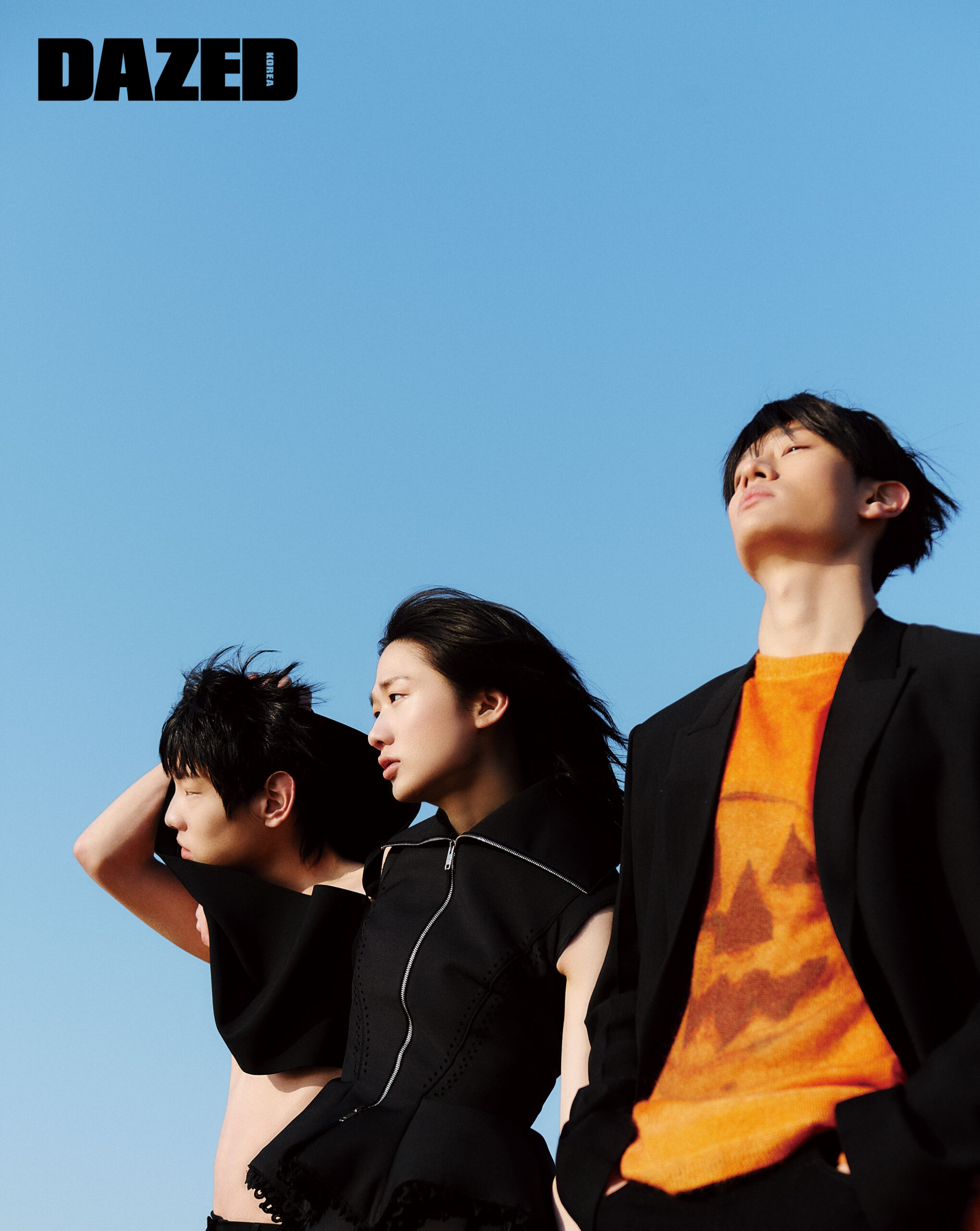 정우가 입은 후드 톱과 블랙 팬츠는 알라이아(ALAÏA). 김온이 입은 블랙 집업 슬리브리스 재킷과 블랙 쇼츠는 지방시(Givenchy). 우형이 입은 블랙 코트와 이너로 입은 니트 톱, 블랙 팬츠는 모두 지방시(Givenchy).